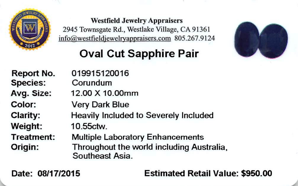 Two oval cut sapphires, measuring 12.00 x 10.00mm, approximate total weight of 10.55ct., clarity is heavily included to severely included, very dark blue color. Indications of multiple laboratory enhancements. Westfield Appraised at $950.00.