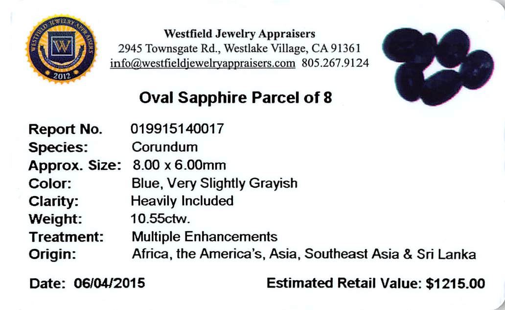 Six oval mixed cut natural blue sapphires, measuring 8.00 x 6.00 x 4.00mm, exact total weight 10.55ct., clarity is heavily included, type II, very dark, very slightly grayish, blue color, (GIA B 8/3), cut is good. Measurements are an average for the group. Transmitting light diffusely, opaque. Naturally occurring internal & external characteristics are present. Indications of multiple laboratory enhancements. Westfield Appraised at $1,215.00.