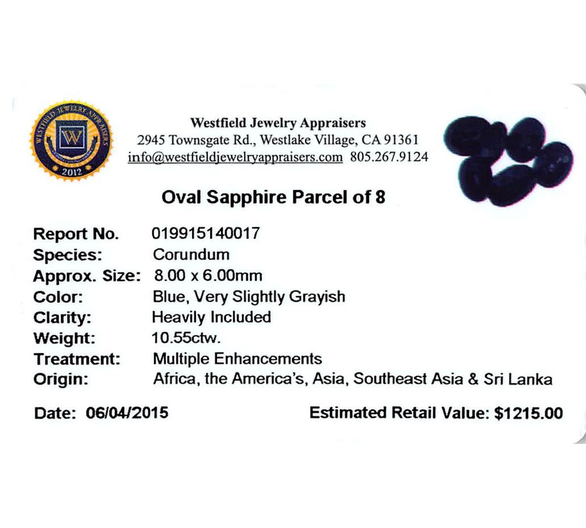 Six oval mixed cut natural blue sapphires, measuring 8.00 x 6.00 x 4.00mm, exact total weight 10.55ct., clarity is heavily included, type II, very dark, very slightly grayish, blue color, (GIA B 8/3), cut is good. Measurements are an average for the group. Transmitting light diffusely, opaque. Naturally occurring internal & external characteristics are present. Indications of multiple laboratory enhancements. Westfield Appraised at $1,215.00.