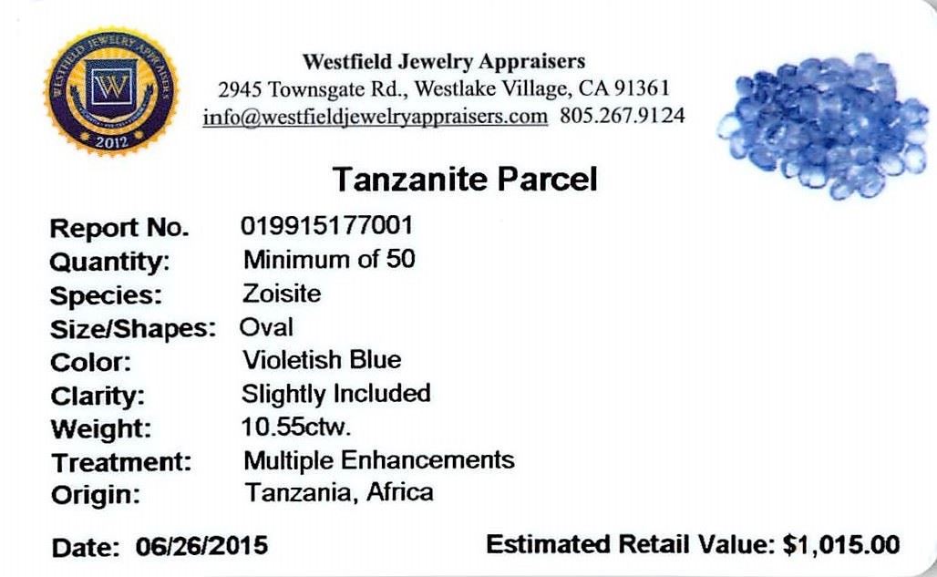 Fifty oval mixed cut natural tanzanites, measuring 4.00 x 3.00 x 1.95mm, exact total weight 10.55ct., clarity is slightly included, type I, medium, very slightly grayish, violetish blue color, (GIA vB 5/3), cut is good. Measurements & the color grade are an average for the group, Color grade is an average for the group, Transmitting light with no distortion, transparent, Naturally occurring internal & external characteristics are present, Indications of multiple laboratory enhancements, including high temperature heat treatment. Westfield Appraised at $1,015.00.