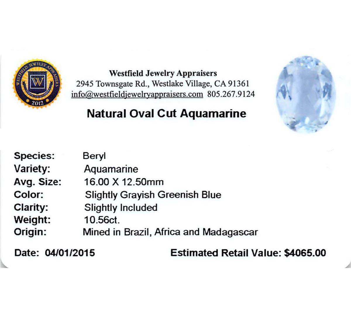 One oval cut natural aquamarine exact weight 10.56ct., clarity is slightly included, type I, medium light, slightly grayish, very slightly greenish blue color, (GIA vslgB 4/2), cut is good. Westfield Appraised at $4,065.00.