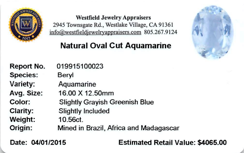 One oval cut natural aquamarine exact weight 10.56ct., clarity is slightly included, type I, medium light, slightly grayish, very slightly greenish blue color, (GIA vslgB 4/2), cut is good. Westfield Appraised at $4,065.00.