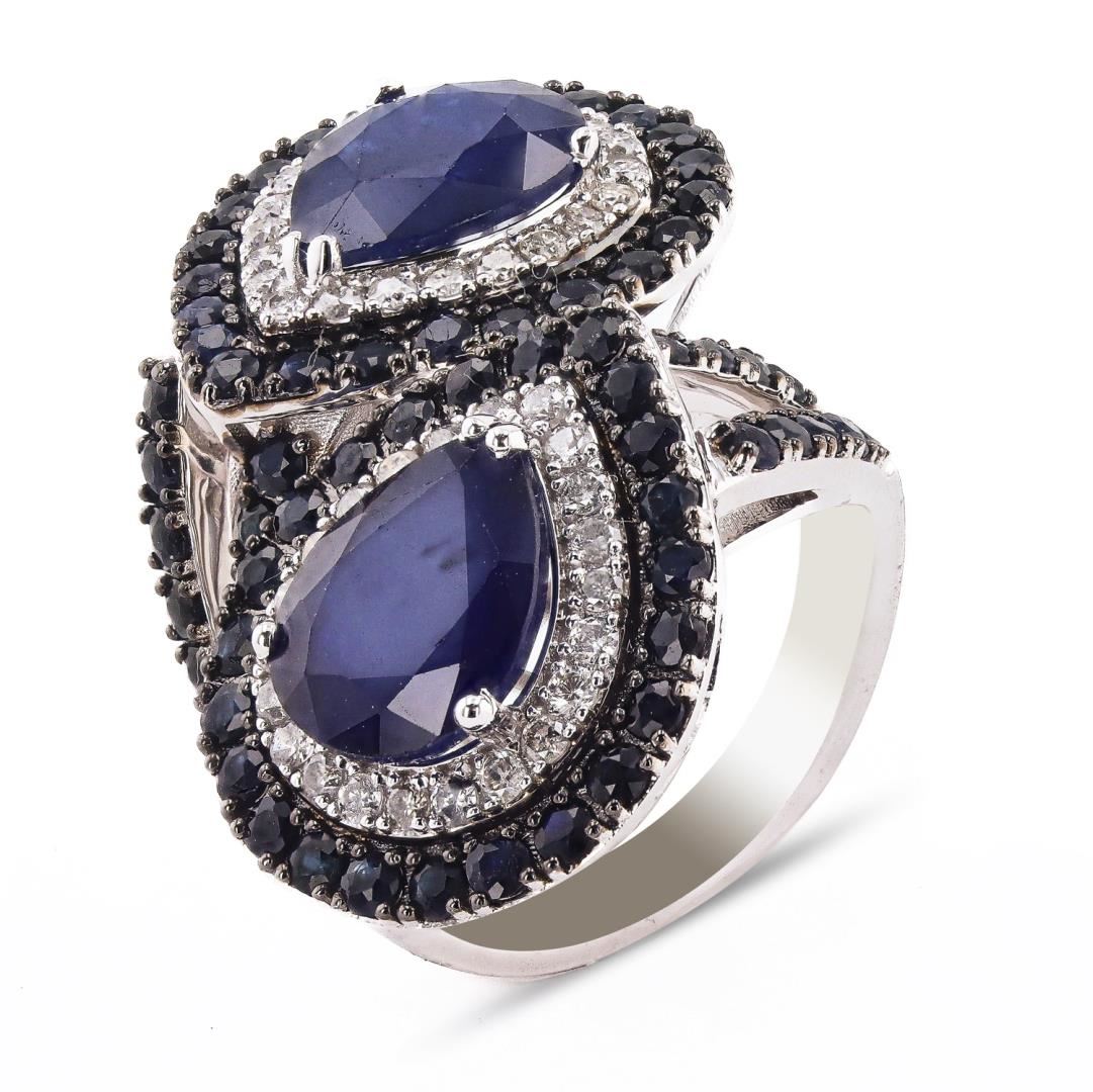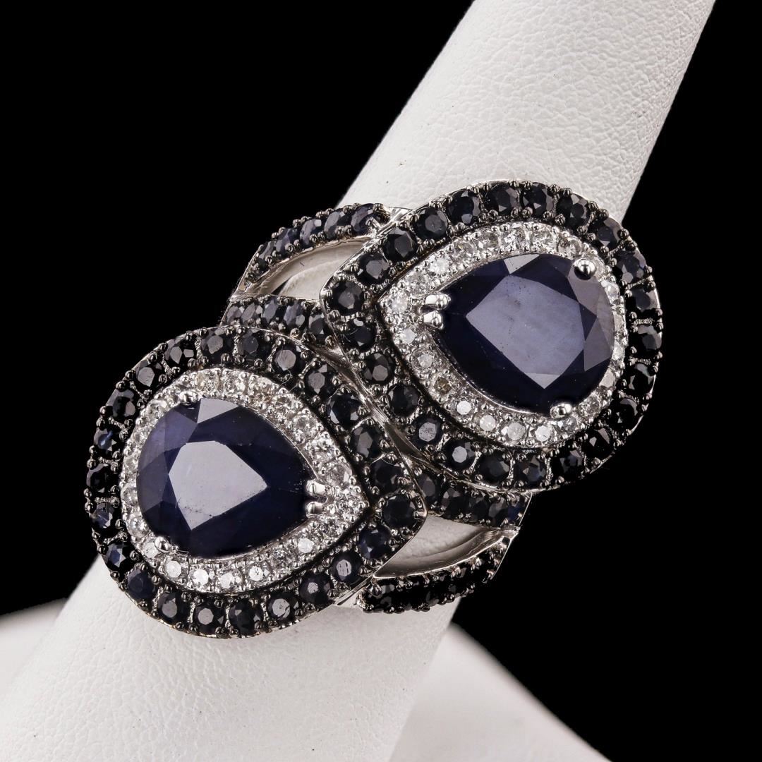 One polished, stamped, and tested 14K white gold Oscar Friedman designer ring with a bright finish. The ring is mounted with 68 faceted sapphires weighing approximately 10.57 carats, and 44 genuine round diamonds weighing approximately 0.70 carats. This itemweighs 11.8 grams, condition is new, excellent workmanship. #MAIN GEMSTONES# Species: Natural Corundum Variety: Sapphire Shape: Pear / Round Quantity: 64 Sapphires Measurements: 11 x 9mm (2 pear), 1.8 - 2.0 mm (62 round) Total Weight: 10.57 carats Color: Dark Blue Cut Grade: Very Good Transparency: Translucent to Opaque Treatment: Heat with Residues Refractive Index: 1.762- 1.770 DR Birefringence: 0.008 - 0.010 Hardness: 9 #ADJACENT GEMSTONES ON RING# Identity: Natural Diamond Shape: Round Quantity: 44 Diamonds Measurements: 1.5 - 1.7mm Total Weight: 0.70 carats Clarity Grade: SI2 - I2 Color Grade: I - K Refractive Index: 2.418 Hardness: 10 WEIGHT OF ITEM: 11.8 grams TOTAL SAPPHIRE WEIGHT: 10.57 cts TOTAL DIAMOND WEIGHT: 0.70 cts GOLD CONTENT: 14K White Gold Size: 6.5