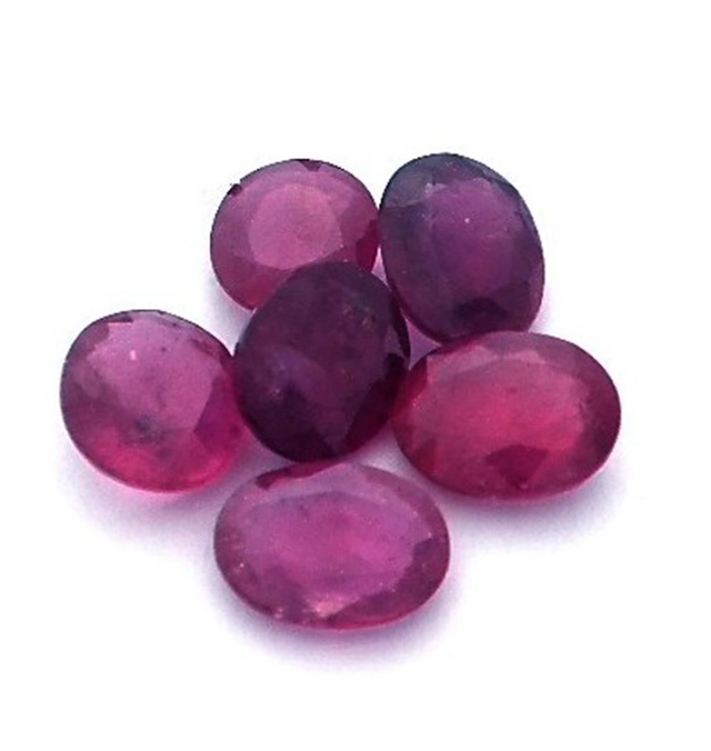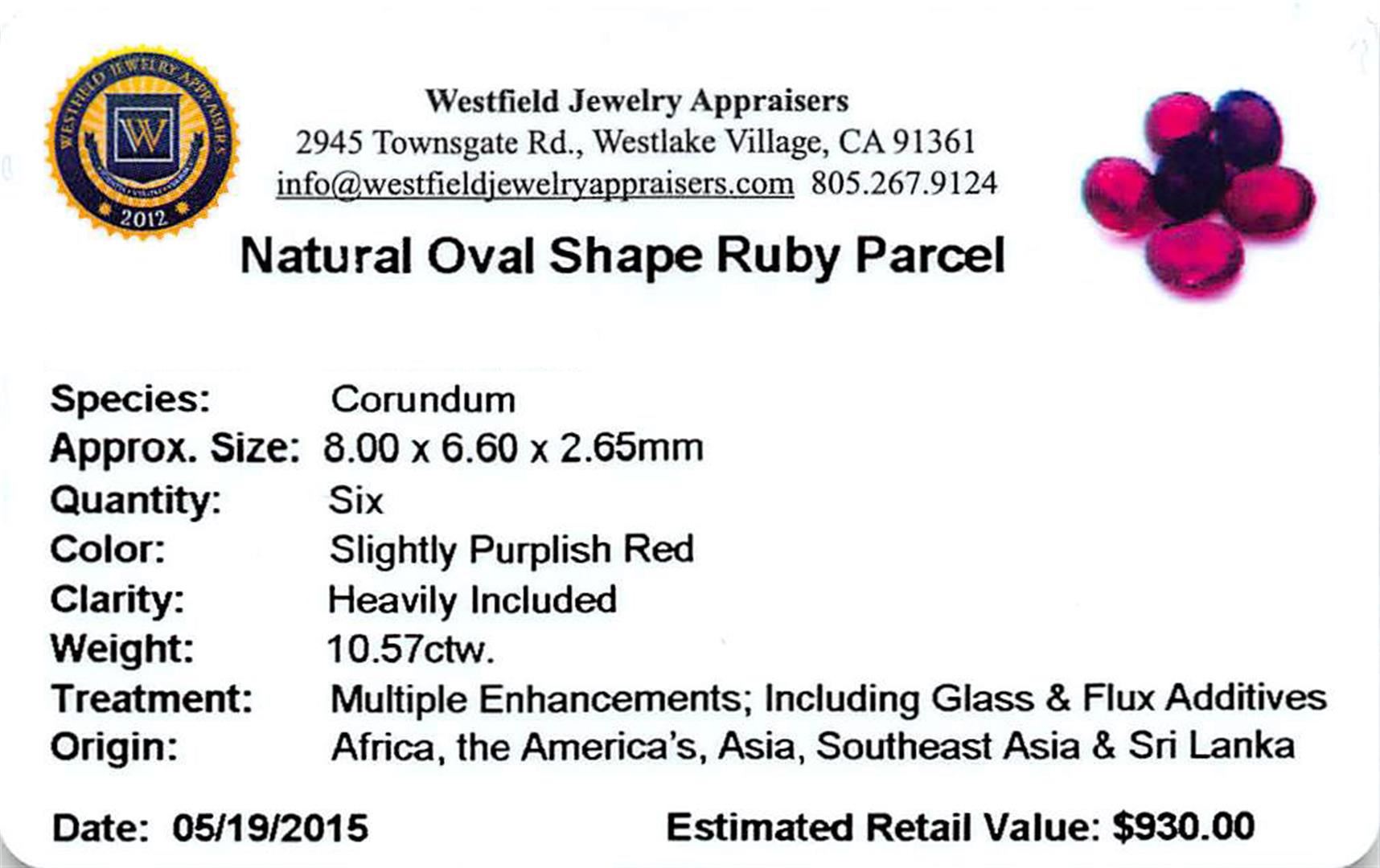 Seven oval mixed cut natural rubies, measuring 8.00 x 6.60 x 2.65mm, exact total weight 10.57ct., clarity is heavily included, type II, dark, very slightly brownish, slightly purplish red color, (GIA slpR 7/3), cut is good. Measurements are an average for the group. Transmitting light somewhat diffusely, transparent to translucent. Naturally occurring internal & external characteristics are present. Indications of laboratory high temperature heat treatment, with glass & flux additives. Westfield Appraised at $930.00.