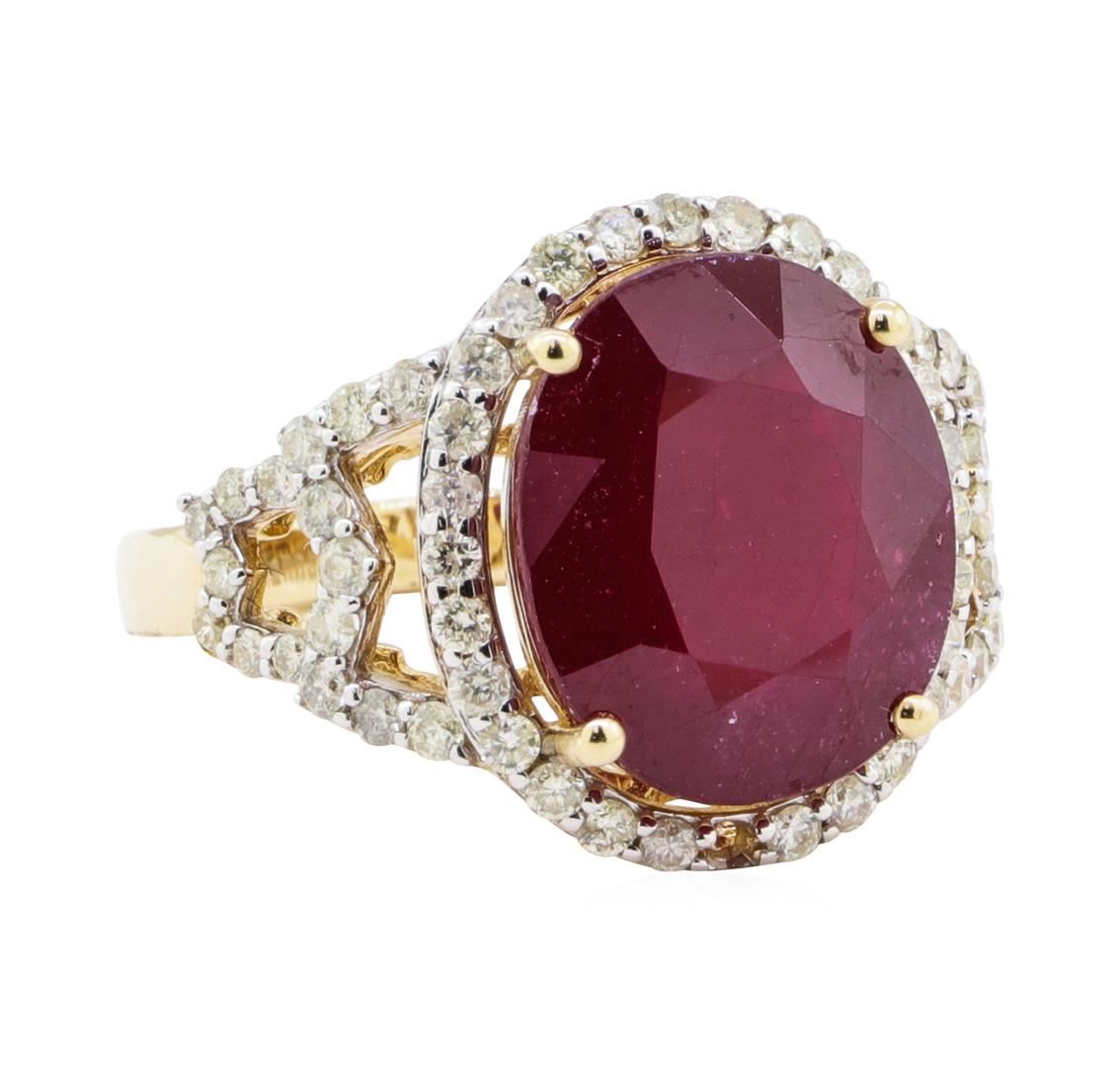 One electronically tested 14KT yellow gold ladies cast ruby and diamond ring. The featured ruby is set within a diamond bezel supported by a lattice under gallery and stylized diamond set shoulders, completed by a two and one-half millimeter wide band. Bright polish finish with rhodium accents. Trademark is Orianne. Identified with markings of "14K". Condition is new, good workmanship. Containing: One prong set oval mixed cut natural ruby, measuring 13.85 x 11.65 x 6.50mm, 20% bulge factor, approximate weight of 10.57ct., clarity is heavily included, type II, dark, very slightly brownish, slightly purplish red color, (GIA slpR 7/3), cut is good. Transmitting light somewhat diffusely, transparent to translucent. Naturally occurring internal & external characteristics are present. Indications of laboratory high temperature heat treatment, with glass & flux additives. Graded in the setting. Ruby has a low tolerance to rhodium plating, repolishing the surface, & ultrasonic cleaning. Sixty prong set round brilliant cut diamonds approximate total weight of 60 Stones = 0.85ct. The color grade reflects the entire range of color for this group. Graded in the setting. Clarity I-1 to I-3 Color H - K Total Weight of Colored Stones 10.57 ct. Total Weight of Diamonds 0.85 ct. Total Weight of Ring 6.40 gm Estimated Retail Value $ 4,540.00 US AIG Appraised.
