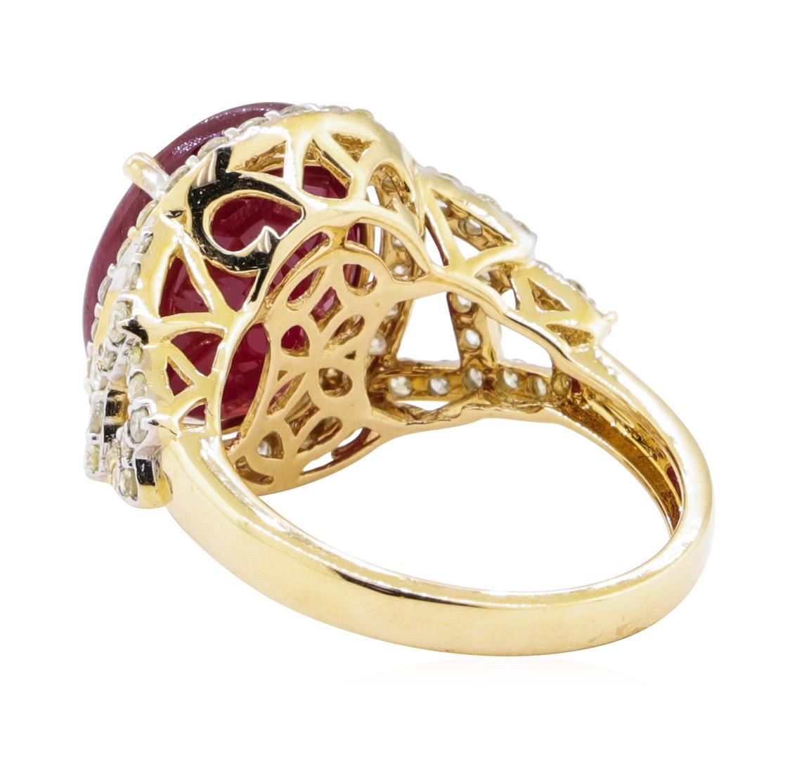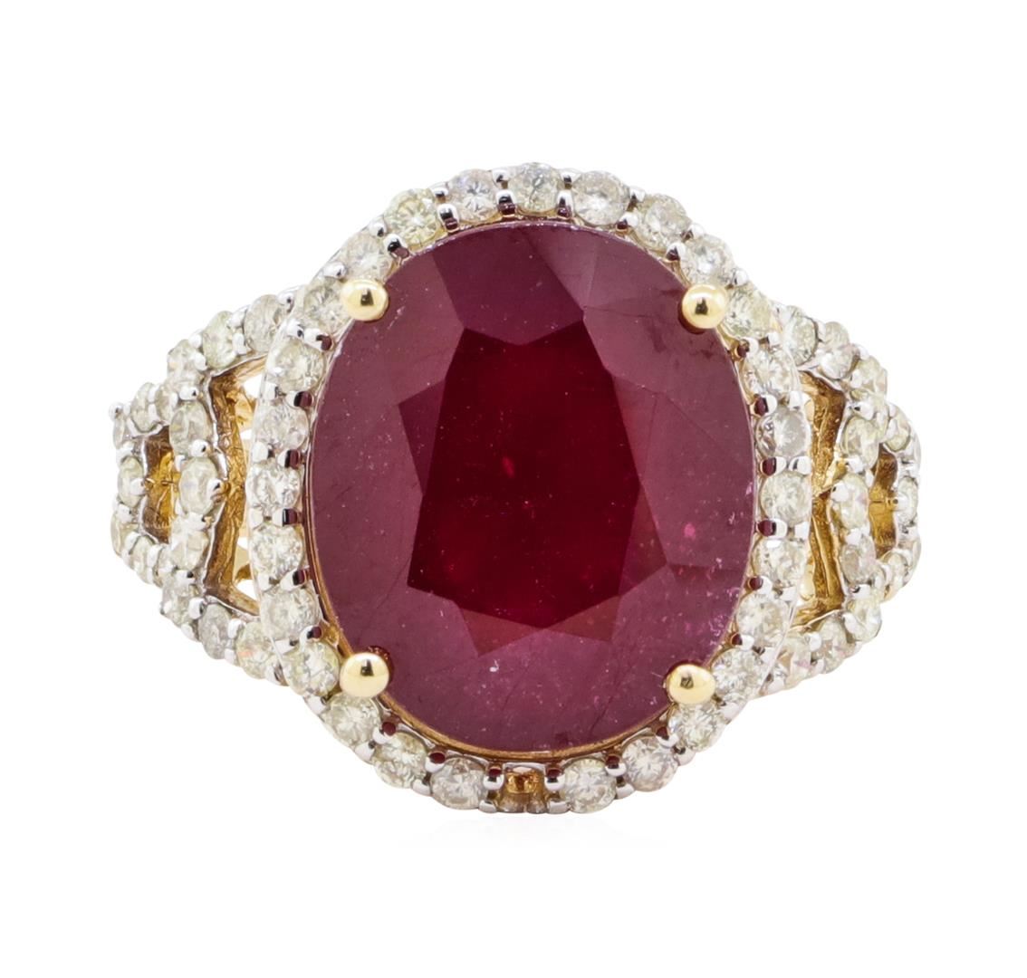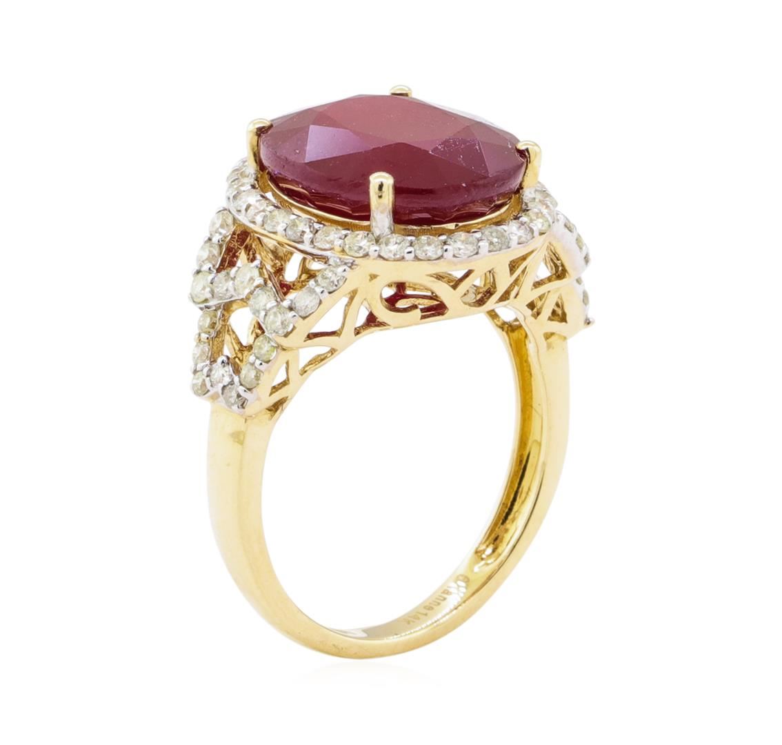 One electronically tested 14KT yellow gold ladies cast ruby and diamond ring. The featured ruby is set within a diamond bezel supported by a lattice under gallery and stylized diamond set shoulders, completed by a two and one-half millimeter wide band. Bright polish finish with rhodium accents. Trademark is Orianne. Identified with markings of "14K". Condition is new, good workmanship. Containing: One prong set oval mixed cut natural ruby, measuring 13.85 x 11.65 x 6.50mm, 20% bulge factor, approximate weight of 10.57ct., clarity is heavily included, type II, dark, very slightly brownish, slightly purplish red color, (GIA slpR 7/3), cut is good. Transmitting light somewhat diffusely, transparent to translucent. Naturally occurring internal & external characteristics are present. Indications of laboratory high temperature heat treatment, with glass & flux additives. Graded in the setting. Ruby has a low tolerance to rhodium plating, repolishing the surface, & ultrasonic cleaning. Sixty prong set round brilliant cut diamonds approximate total weight of 60 Stones = 0.85ct. The color grade reflects the entire range of color for this group. Graded in the setting. Clarity I-1 to I-3 Color H - K Total Weight of Colored Stones 10.57 ct. Total Weight of Diamonds 0.85 ct. Total Weight of Ring 6.40 gm Estimated Retail Value $ 4,540.00 US