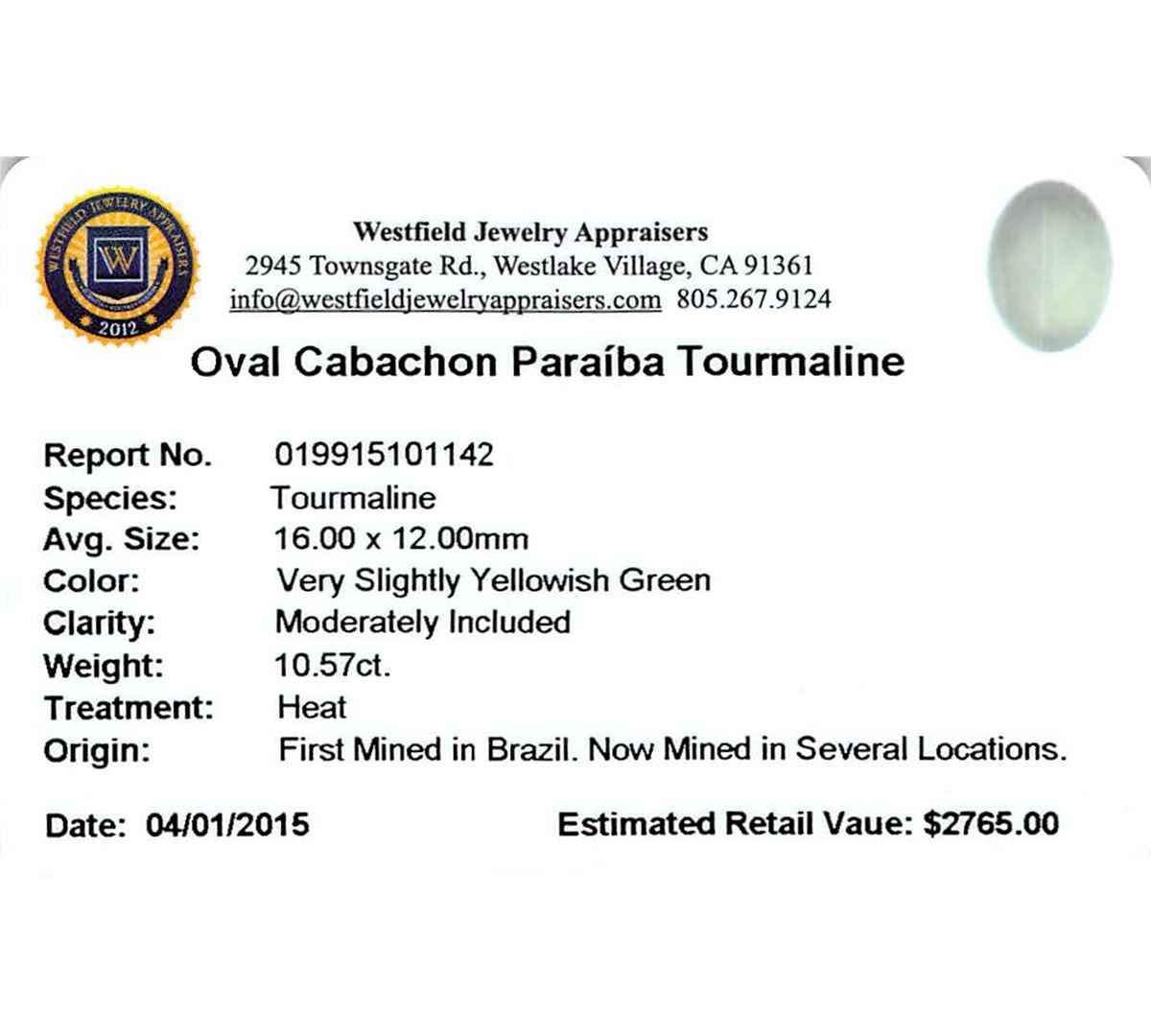 One oval cabochon cut natural Paraiba tourmaline exact weight 10.57ct., clarity is moderately included, cut is good. Westfield Appraised at $2,765.00.