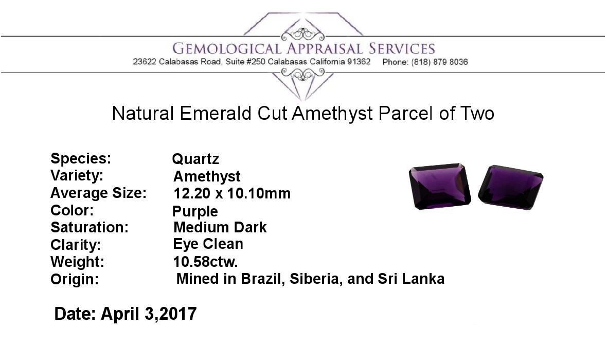 One natural emerald cut amethyst parcel of two with an exact weight of 10.58ctw., clarity is eye clean, purple, medium dark. Gemological Appraisals Services estimates the retail value at $359.72 GAS Appraised.