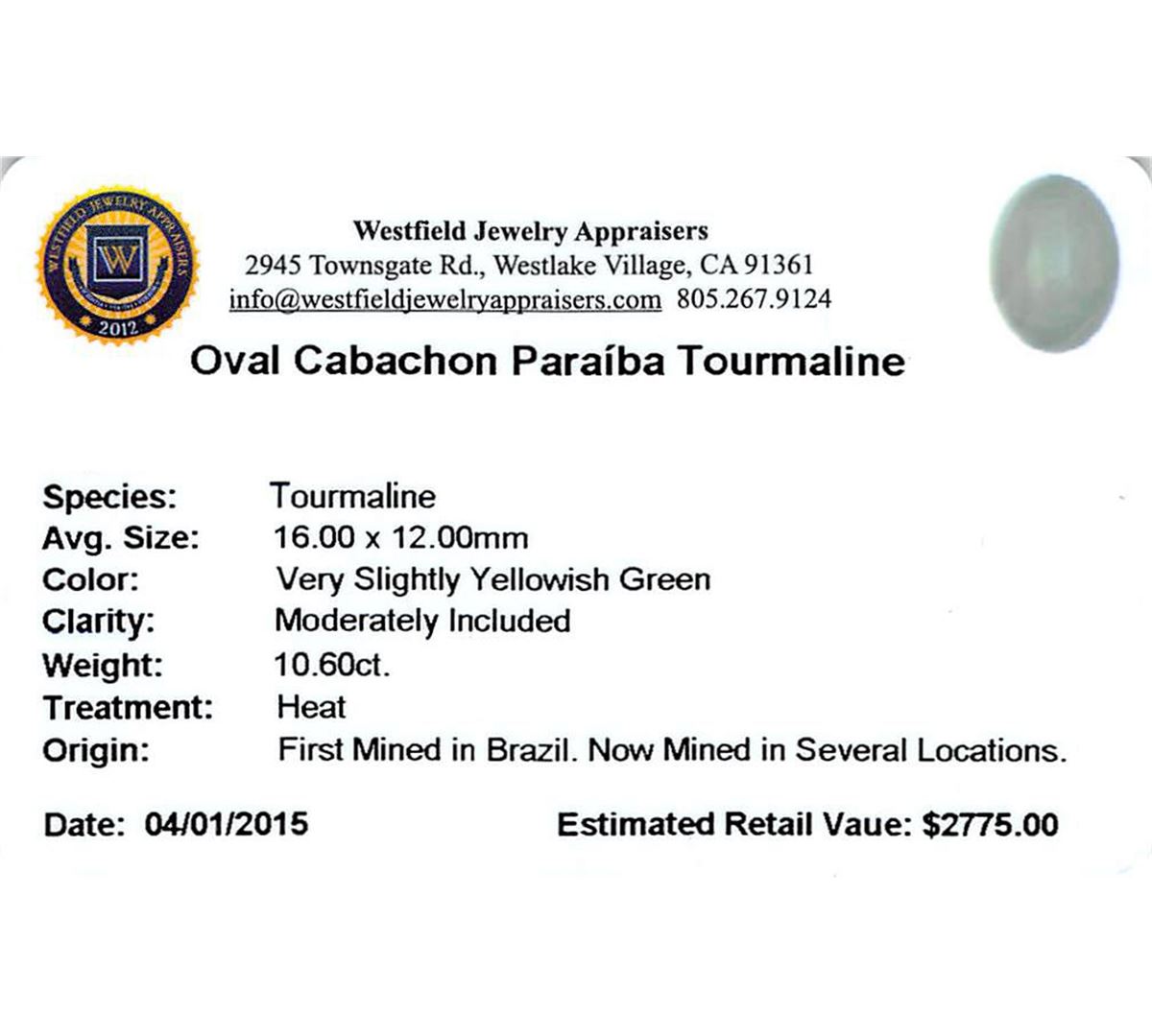 One oval cabochon cut natural Paraiba tourmaline exact weight 10.60ct., clarity is moderately included, cut is good. Westfield Appraised at $2,775.00.