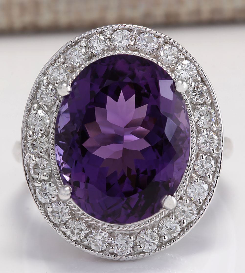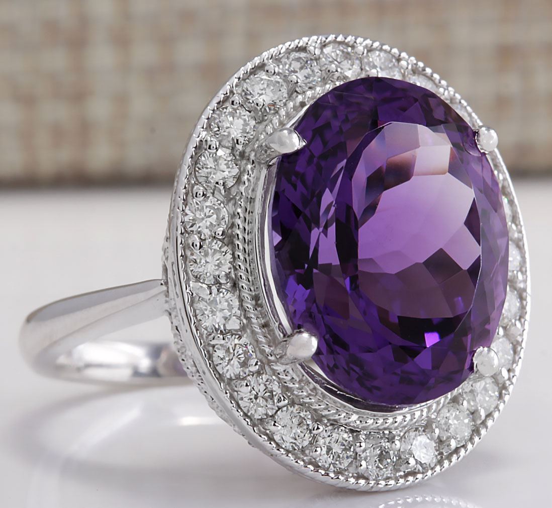 10.60 CTW Natural Amethyst And Diamond Ring In 18K Solid White Gold