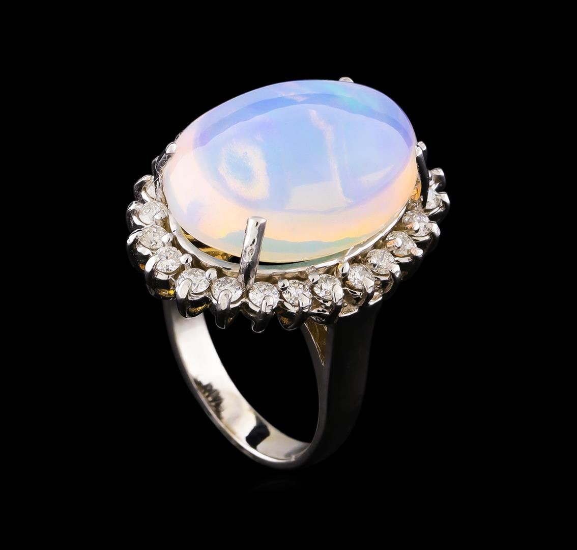 One electronically tested 14KT white gold lady's cast fashion ring with a basket halo with a bright polish finish. The featured lady's ring has a shank measuring 2.87 millimeters wide. Identified with markings of "14K". Condition is new, good workmanship. Containing: One crystal opal that is cut in a oval shaped cabochon and is prong set, measuring 18.35 mm long x 13.61 mm wide, and 9.50 mm thick and the approximate weight is 10.60 carats. The opal has a somewhat bright, blue-green play of color (fire) in a rolling flashfire pattern; a high dome; a good cut; no inclusions; consistent in its brightness and pattern; and is not directional. Graded in the setting. Twenty-Four prong set round brilliant cut diamonds, measuring 2.10 - 2.00 x 1.27mm (depth est.) approximate total weight of 24 Stones = 0.80ct. Graded in the setting. Clarity: SI-1 to SI-2. Color: H - I. Cut Good. Total Weight of Diamonds 0.80ct. Total Weight of Opals 10.60ct. Total Weight of Ring 9.20gm. GAS Appraised at $6,775.00.
