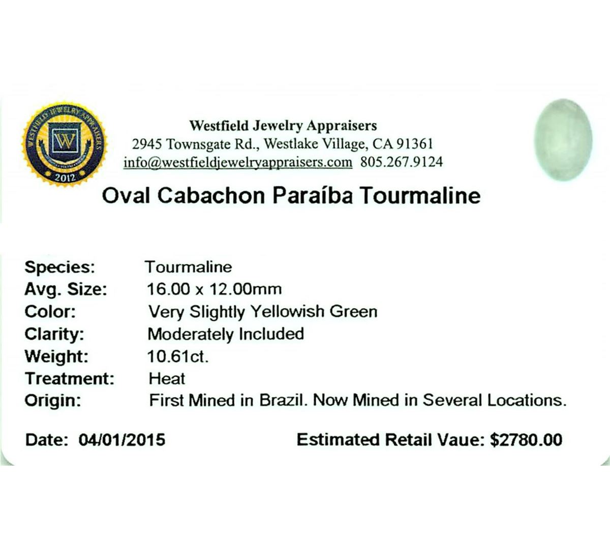 One oval cabochon cut natural Paraiba tourmaline exact weight 10.61ct., clarity is moderately included, cut is good. Westfield Appraised at $2,780.00.