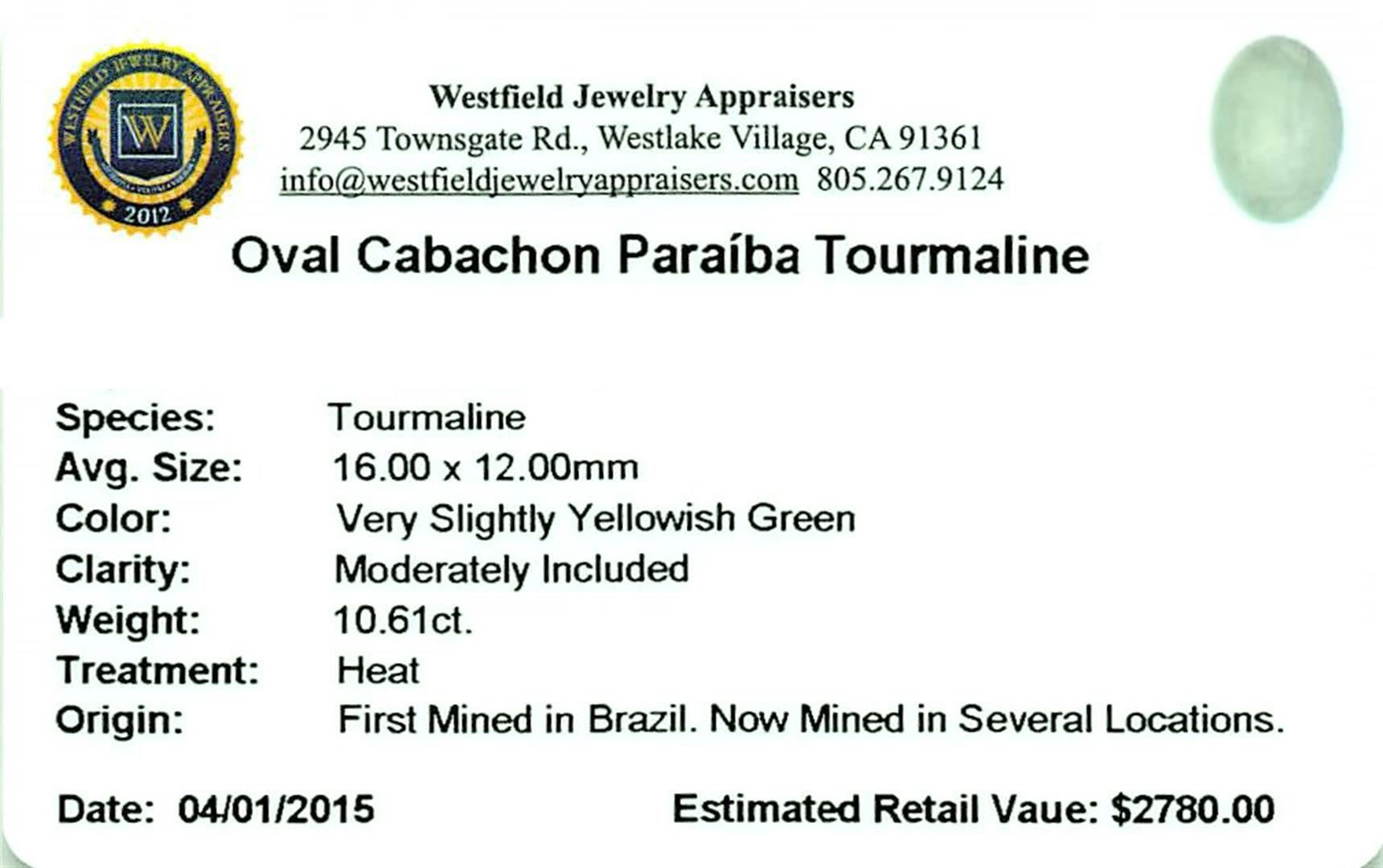 One oval cabochon cut natural Paraiba tourmaline exact weight 10.61ct., clarity is moderately included, cut is good. Westfield Appraised at $2,780.00.