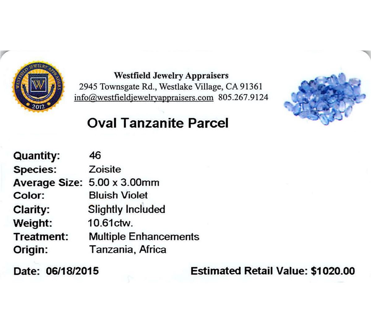 Forty-six oval mixed cut natural tanzanites, measuring 5.00 x 3.00 x 1.95mm, exact total weight 10.61ct., clarity is slightly included, type I, medium, very slightly grayish, bluish violet color, (GIA bV 5/3), cut is good. Transmitting light with a minimum of distortion, transparent. Naturally occurring internal & external characteristics are present. Measurements & the color grade are an average for the group. Tanzanite is a very rare gemstone that is only found in the country of Tanzania. Originally discovered in 1967. Tiffany & Company, named the stone Tanzanite. It is found in the Usumburu Mountains that border the Umba Valley of northern Tanzania. Tanzanite occurs in gray, brown, violet, blue, reddish-purple, & green. The gem is interesting because of its exceptional pleochroism. Rotated in different directions a tanzanite will exhibit multiple changes of color. Tanzanite has a low tolerance to ultrasonic cleaning, and should not be cleaned using this method. Westfield Appraised at $1,020.00.