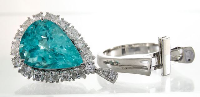 One ring featuring: 18KT White Gold weighing 13.44 grams containing one oval cut Paraiba Tourmaline with a total weight of 10.61 ct and diamonds weighing a total of 1.89 ctw. GRS Appraised.