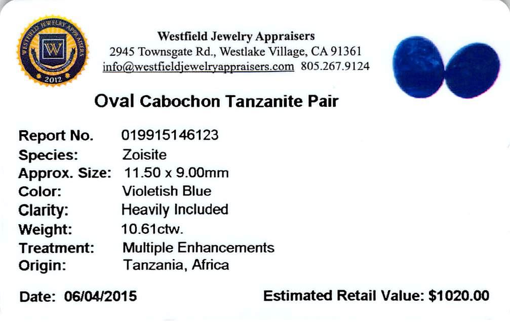 Two oval cabochon cut natural tanzanites, measuring 11.50 x 9.00 x 6.00mm, exact total weight 10.61ct., clarity is heavily included, type I, dark, moderately strong, violetish blue color, (GIA vB 7/4), cut is good. Transmitting light somewhat diffusely, transparent to translucent. Naturally occurring internal & external characteristics are present. Measurements & the color grade are an average for the pair. Tanzanite is a very rare gemstone that is only found in the country of Tanzania. Originally discovered in 1967. Tiffany & Company, named the stone Tanzanite. It is found in the Usumburu Mountains that border the Umba Valley of northern Tanzania. Tanzanite occurs in gray, brown, violet, blue, reddish-purple, & green. The gem is interesting because of its exceptional pleochroism. Rotated in different directions a tanzanite will exhibit multiple changes of color. Tanzanite has a low tolerance to ultrasonic cleaning, and should not be cleaned using this method. Westfield Appraised at $1,020.00.
