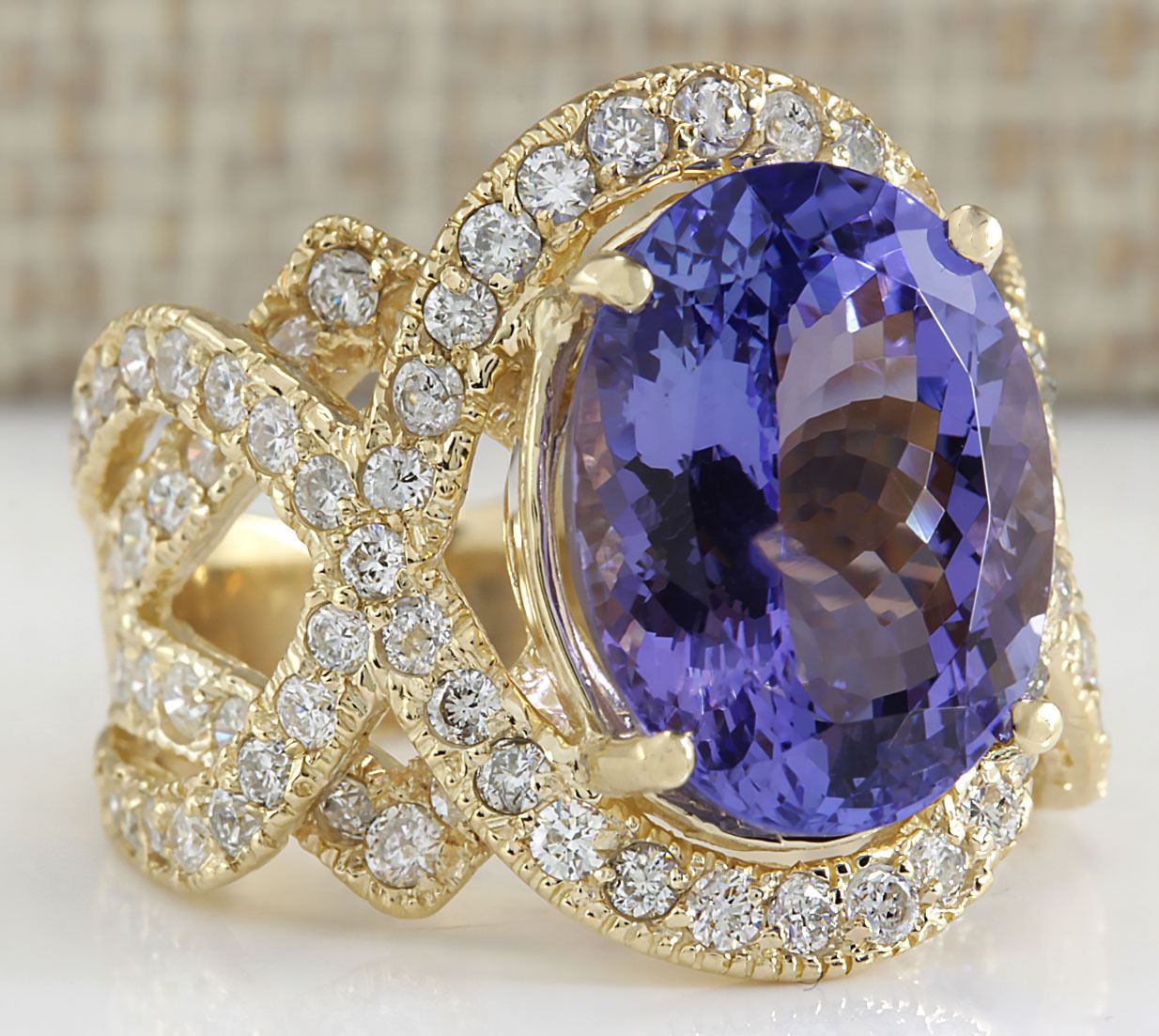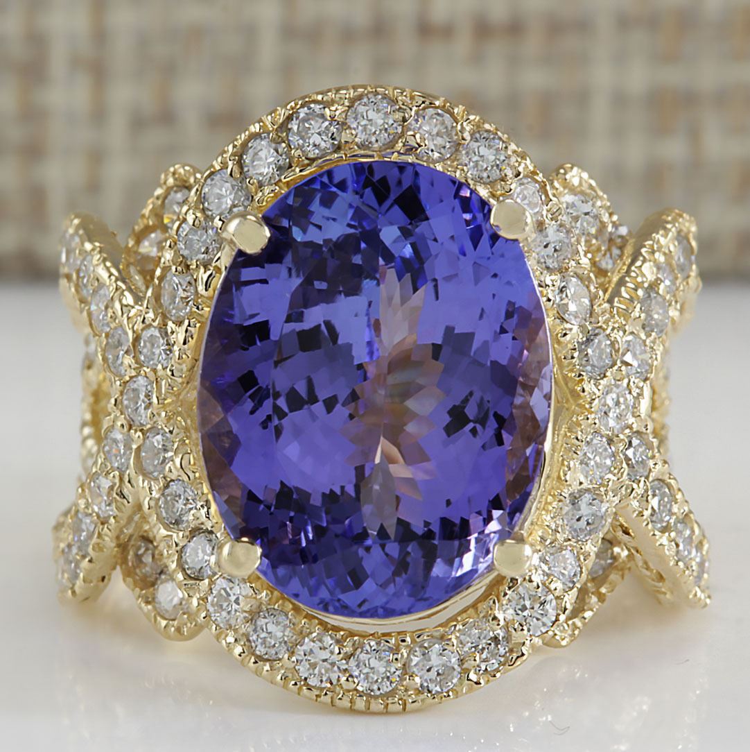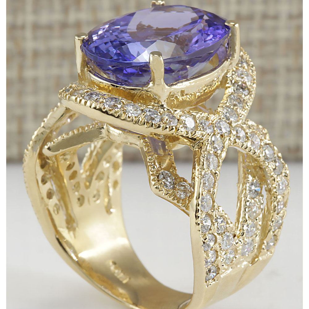 10.62 CTW Natural Blue Tanzanite And Diamond Ring In 18K Solid Yellow Gold