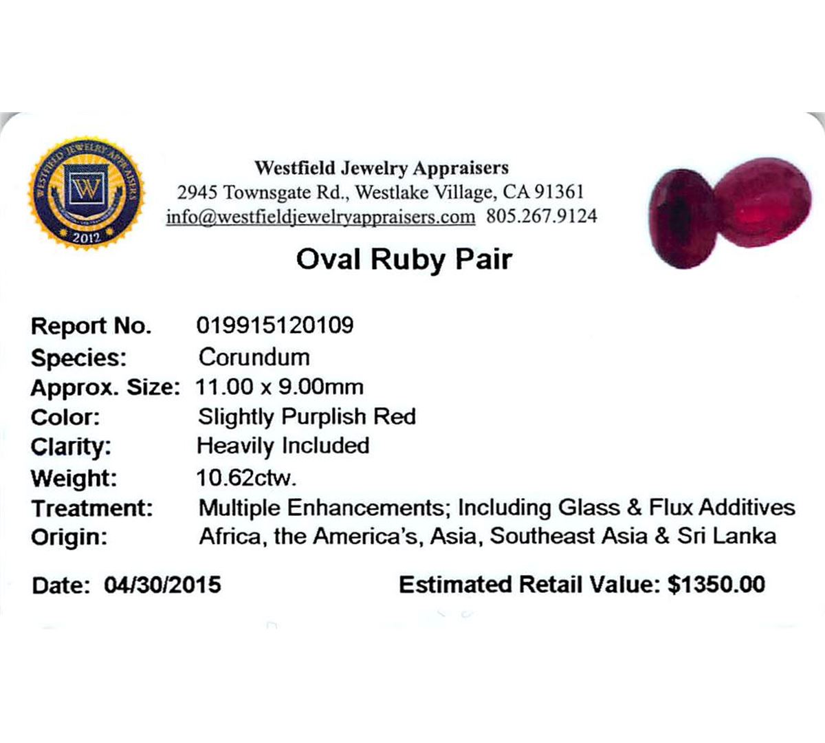 Two oval mixed cut natural rubies exact total weight 10.62ct., clarity is heavily included, type II, dark, very slightly brownish, slightly purplish red color, (GIA slpR 7/3), cut is good. Westfield Appraised at $1,350.00.