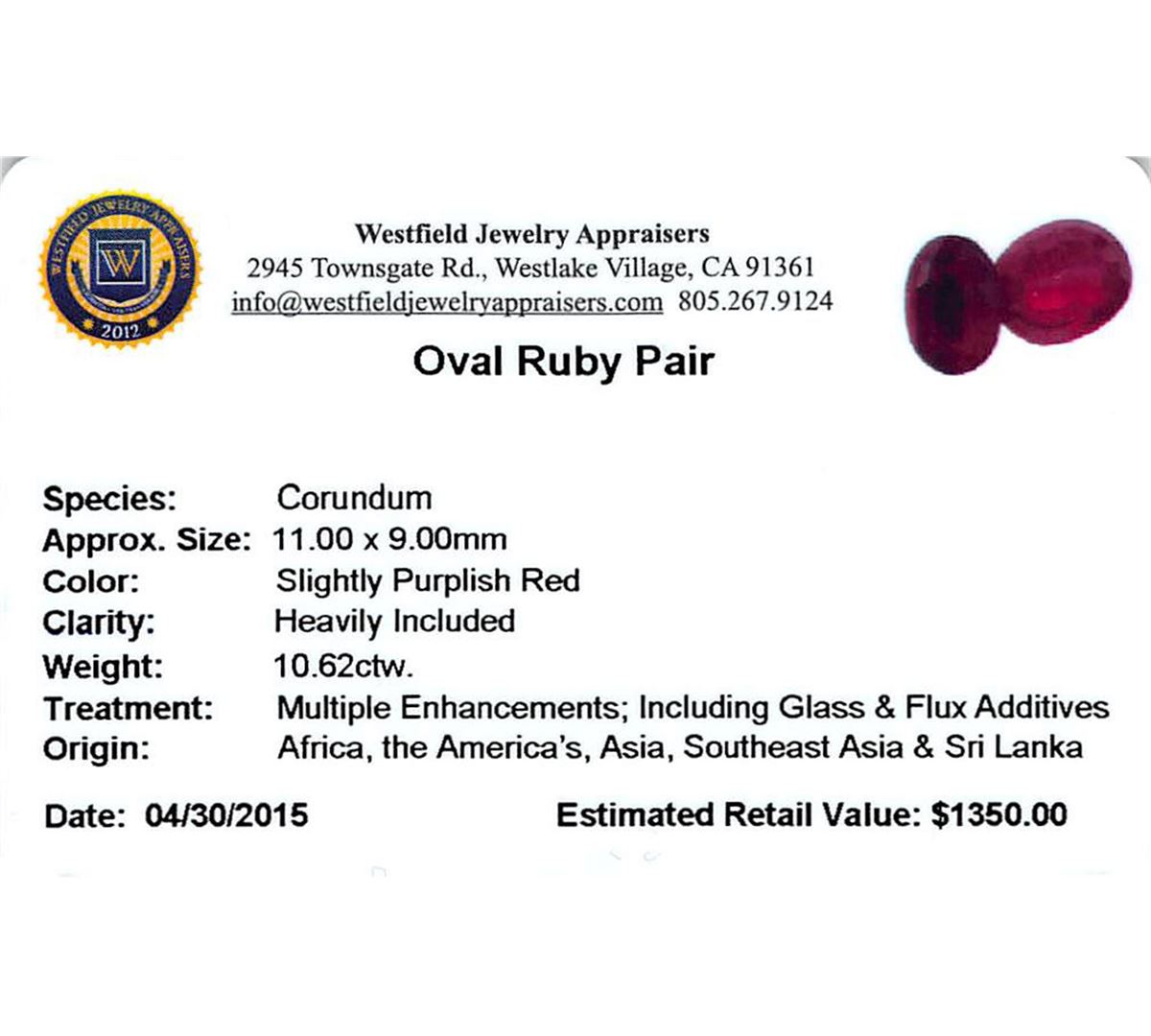Two oval mixed cut natural rubies exact total weight 10.62ct., clarity is heavily included, type II, dark, very slightly brownish, slightly purplish red color, (GIA slpR 7/3), cut is good. Westfield Appraised at $1,350.00.