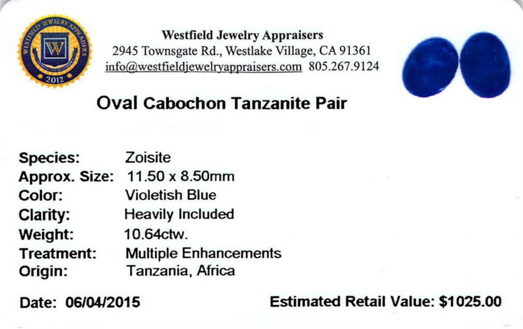 Two oval cabochon cut natural tanzanites, measuring 11.50 x 8.50 x 5.53mm, exact total weight 10.64ct., clarity is heavily included, type I, dark, moderately strong, violetish blue color, (GIA vB 7/4), cut is good. Transmitting light somewhat diffusely, transparent to translucent. Naturally occurring internal & external characteristics are present. Measurements & the color grade are an average for the pair. Tanzanite is a very rare gemstone that is only found in the country of Tanzania. Originally discovered in 1967. Tiffany & Company, named the stone Tanzanite. It is found in the Usumburu Mountains that border the Umba Valley of northern Tanzania. Tanzanite occurs in gray, brown, violet, blue, reddish-purple, & green. The gem is interesting because of its exceptional pleochroism. Rotated in different directions a tanzanite will exhibit multiple changes of color. Tanzanite has a low tolerance to ultrasonic cleaning, and should not be cleaned using this method. Westfield Appraised.