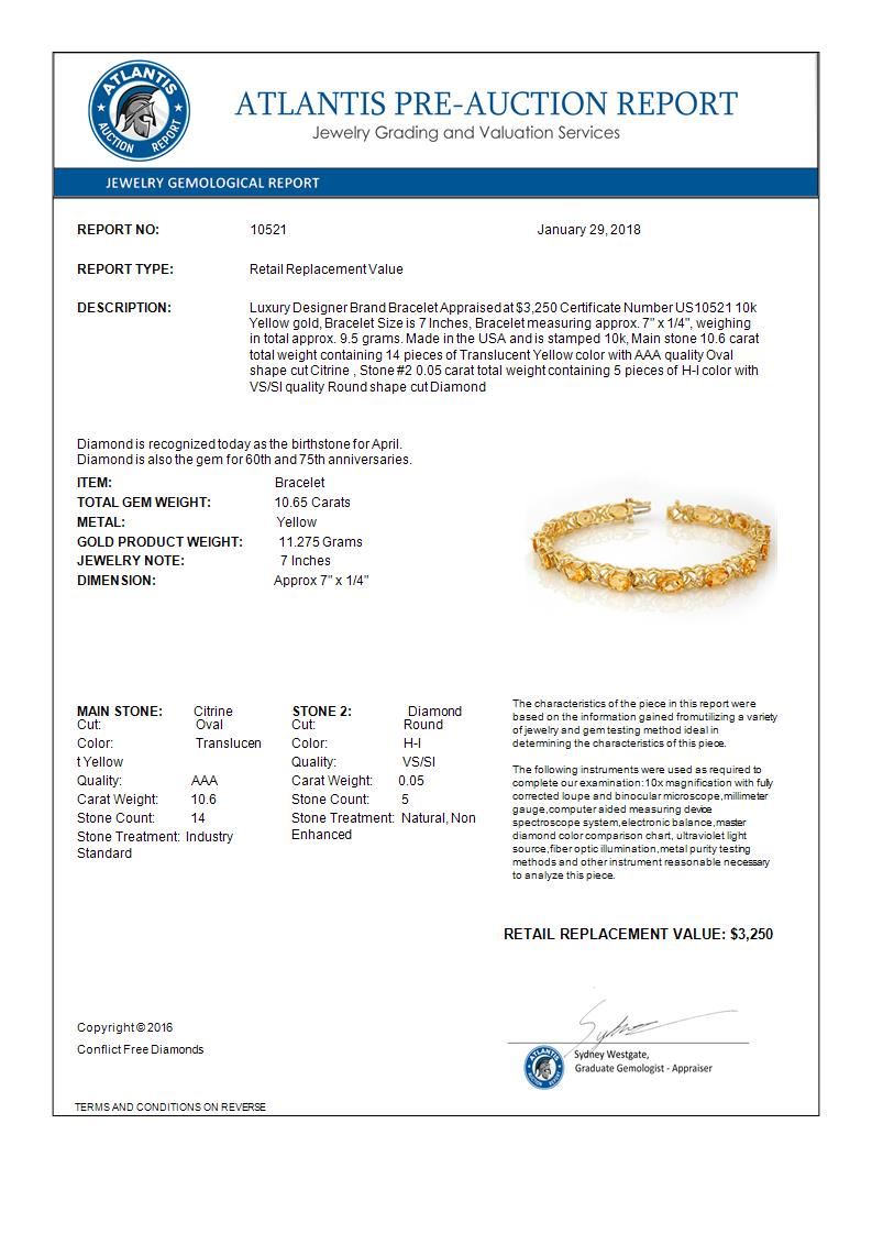 REF-53T5M -10521 ---- 10.65 CTW Citrine & Diamond Bracelet 10K Yellow Gold ---- Luxury Designer Brand Bracelet Appraised at $3,250 Certificate Number US10521 10k Yellow gold, Bracelet Size is 7 Inches, Bracelet measuring approx. 7" x 1/4", weighing in total approx. 9.5 grams. Made in the USA and is stamped 10k, Main stone 10.6 carat total weight containing 14 pieces of Translucent Yellow color with AAA quality Oval shape cut Citrine , Stone #2 0.05 carat total weight containing 5 pieces of H-I color with VS/SI quality Round shape cut Diamond
