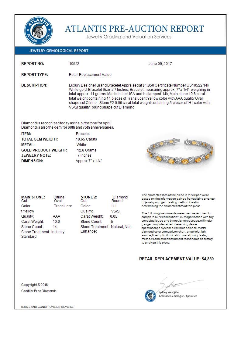 10.65 CTW Citrine & Diamond Bracelet 14K White Gold ---- Luxury Designer Brand Bracelet Appraised Retail Price at $4,850 ---- SKU Number US10522 14k White gold Bracelet Size is 7 Inches, Bracelet measuring approx. 7" x 1/4", weighing in total approx. 11 grams. Made in the USA and is stamped 14k, Main stone 10.6 carat total weight containing 14 pieces of Translucent Yellow color with AAA quality Oval shape cut Citrine , Stone #2 0.05 carat total weight containing 5 pieces of H-I color with VS/SI quality Round shape cut