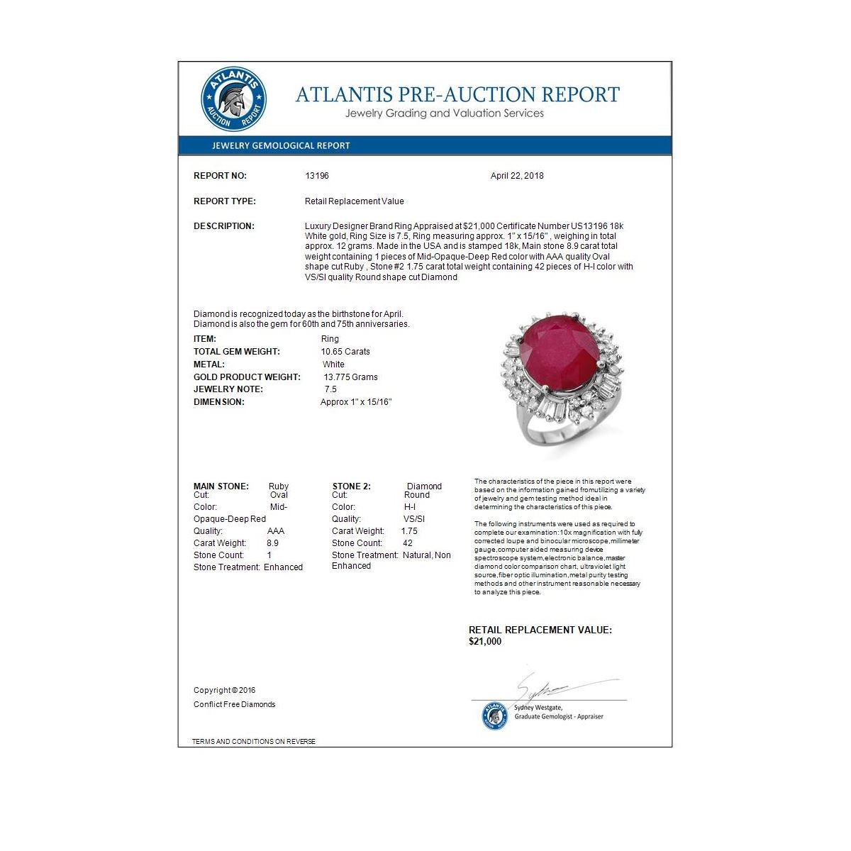 REF-272H8A -13196 ---- 10.65 CTW Ruby & Diamond Ring 18K White Gold ---- Luxury Designer Brand Ring Appraised at $21,000 Certificate Number US13196 18k White gold, Ring Size is 7.5, Ring measuring approx. 1" x 15/16" , weighing in total approx. 12 grams. Made in the USA and is stamped 18k, Main stone 8.9 carat total weight containing 1 pieces of Mid-Opaque-Deep Red color with AAA quality Oval shape cut Ruby , Stone #2 1.75 carat total weight containing 42 pieces of H-I color with VS/SI quality Round shape cut Diamond
