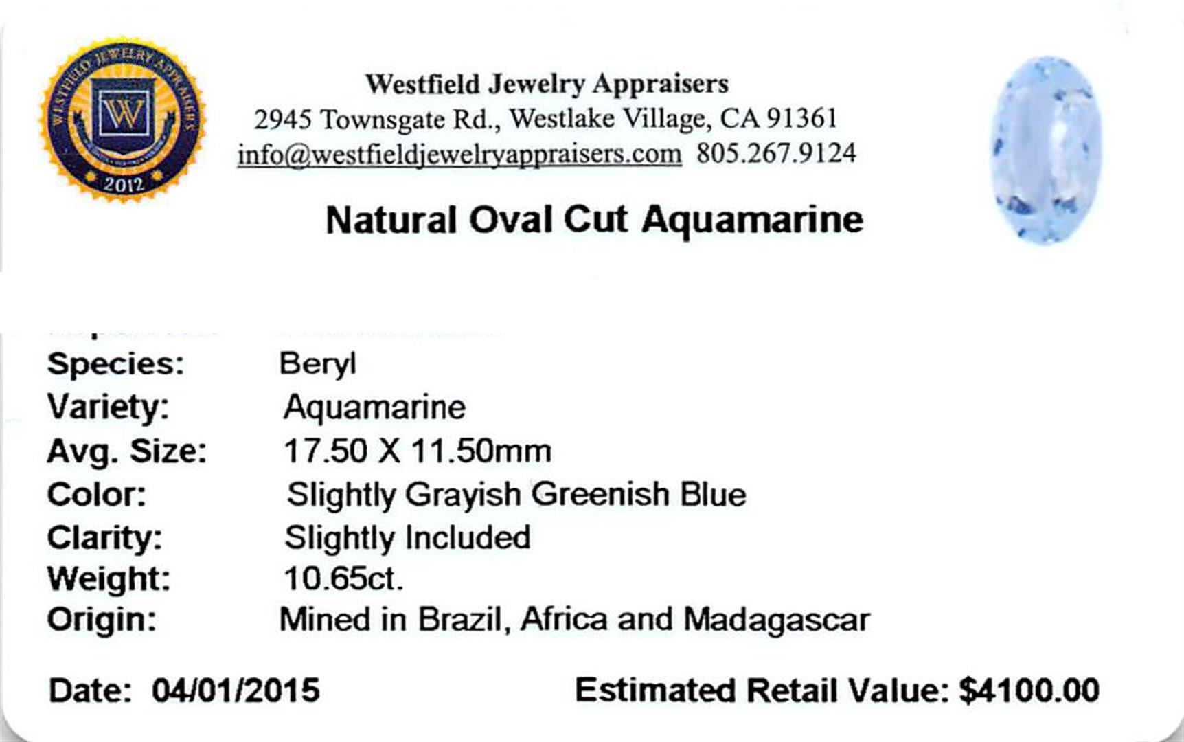 One oval cut natural aquamarine exact weight 10.65ct., clarity is slightly included, type I, medium light, very slightly grayish, very slightly greenish blue color, (GIA vslgB 4/3), cut is good. Westfield Appraised at $4,100.00.