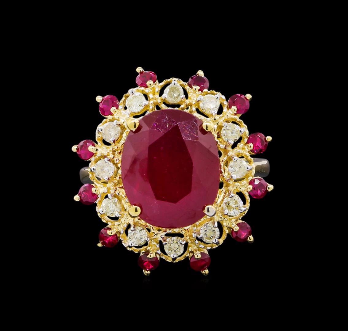 Fourteen karat (14K) yellow gold ruby and diamond ring. One (1) oval and twelve (12) round cut ruby corundum gemstones are prong mounted in the center of the ring. Round brilliant cut diamonds accent the ring around the center gemstones. The ring is cast stamped "14K" and has a gross weight of 7.7 grams. Diamond(s): Shape: Round brilliant cut. Weight: 0.55 carat (12 pcs). Average clarity: SI2-I1. Average color: H-J. Symmetry: Very Good. Polish: Very good. Gemstone(s): Gemstone: Ruby Corundum. Nature: Natural. Shape: Oval and Round, faceted. Quantity: 13, mounted (1 center and 12 side stones). Weight: 10.65 carats total. Center stone dimensions: Length- 13.27 mm. ; Width-10.98mm. Bulge: Visible. Clarity: SI, Type 2/3. Color: Red (5/5). Symmetry: Very Good. Color intensity: Medium. Transparency: Transparent. Tone: Dark. Enhancements: Indications of high temperature heat treatment, with glass and flux additives. Metal(s): Metal: Gold, stamped. Purity: 14K. Color: Yellow. Condition: Excellent. Finish: High polish. GGA Appraised at $5,920.00.