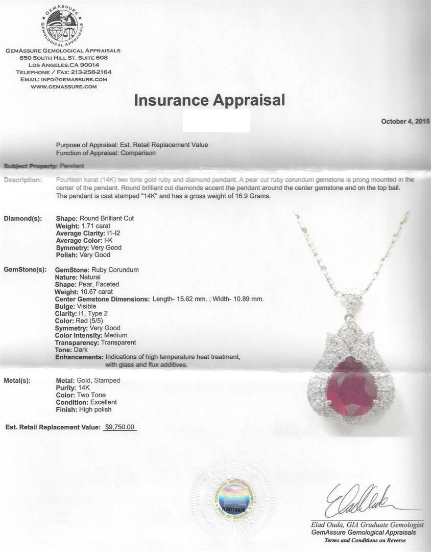 Fourteen karat (14K) two tone gold ruby and diamond pendant. A pear cut ruby corundum gemstone is prong mounted in the center of the pendant. Round brilliant cut diamonds accent the pendant around the center gemstone and on the top bail. The pendant is cast stamped "14K" and has a gross weight of 16.9 Grams. Diamond(s): Shape: Round Brilliant Cut. Weight: 1.71 carat. Average Clarity: I1-I2. Average Color: I-K. Symmetry: Very Good. Polish: Very Good. GemStone(s): GemStone: Ruby Corundum. Nature: Natural. Shape: Pear, Faceted. Weight: 10.67 carat. Center Gemstone Dimensions: Length- 15.62 mm. ; Width- 10.89 mm. Bulge: Visible. Clarity: I1, Type 2. Color: Red (5/5). Symmetry: Very Good. Color Intensity: Medium. Transparency: Transparent. Tone: Dark. Enhancements: Indications of high temperature heat treatment, with glass and flux additives. Metal(s): Metal: Gold, Stamped. Purity: 14K. Color: Two Tone. Condition: Excellent. Finish: High polish. GGA Appraised.
