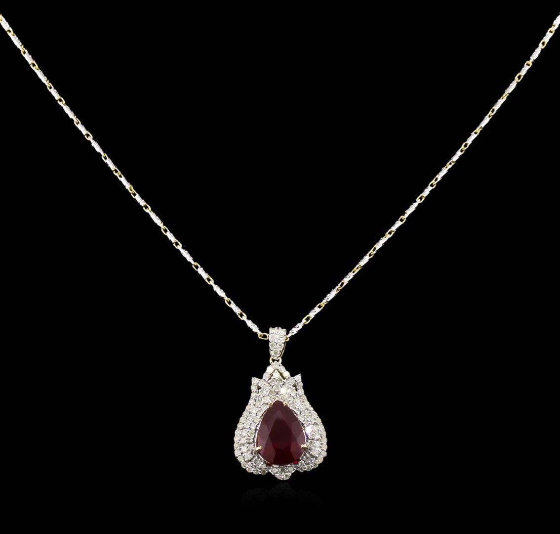 Fourteen karat (14K) two tone gold ruby and diamond pendant. A pear cut ruby corundum gemstone is prong mounted in the center of the pendant. Round brilliant cut diamonds accent the pendant around the center gemstone and on the top bail. The pendant is cast stamped "14K" and has a gross weight of 16.9 Grams. Diamond(s): Shape: Round Brilliant Cut. Weight: 1.71 carat. Average Clarity: I1-I2. Average Color: I-K. Symmetry: Very Good. Polish: Very Good. GemStone(s): GemStone: Ruby Corundum. Nature: Natural. Shape: Pear, Faceted. Weight: 10.67 carat. Center Gemstone Dimensions: Length- 15.62 mm. ; Width- 10.89 mm. Bulge: Visible. Clarity: I1, Type 2. Color: Red (5/5). Symmetry: Very Good. Color Intensity: Medium. Transparency: Transparent. Tone: Dark. Enhancements: Indications of high temperature heat treatment, with glass and flux additives. Metal(s): Metal: Gold, Stamped. Purity: 14K. Color: Two Tone. Condition: Excellent. Finish: High polish. GGA Appraised.