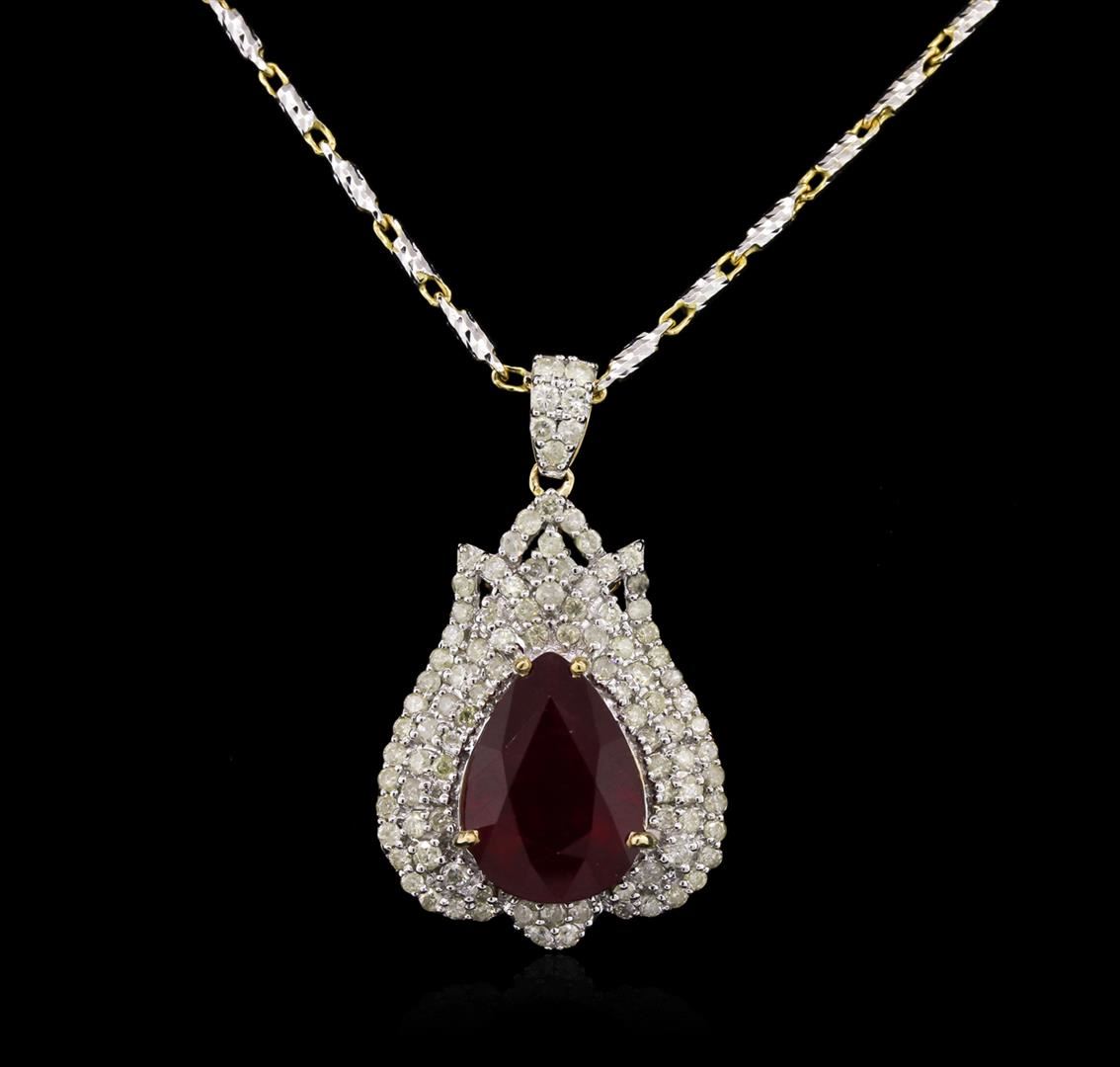Fourteen karat (14K) two tone gold ruby and diamond pendant. A pear cut ruby corundum gemstone is prong mounted in the center of the pendant. Round brilliant cut diamonds accent the pendant around the center gemstone and on the top bail. The pendant is cast stamped "14K" and has a gross weight of 16.9 Grams. Diamond(s): Shape: Round Brilliant Cut. Weight: 1.71 carat. Average Clarity: I1-I2. Average Color: I-K. Symmetry: Very Good. Polish: Very Good. GemStone(s): GemStone: Ruby Corundum. Nature: Natural. Shape: Pear, Faceted. Weight: 10.67 carat. Center Gemstone Dimensions: Length- 15.62 mm. ; Width- 10.89 mm. Bulge: Visible. Clarity: I1, Type 2. Color: Red (5/5). Symmetry: Very Good. Color Intensity: Medium. Transparency: Transparent. Tone: Dark. Enhancements: Indications of high temperature heat treatment, with glass and flux additives. Metal(s): Metal: Gold, Stamped. Purity: 14K. Color: Two Tone. Condition: Excellent. Finish: High polish. GGA Appraised.