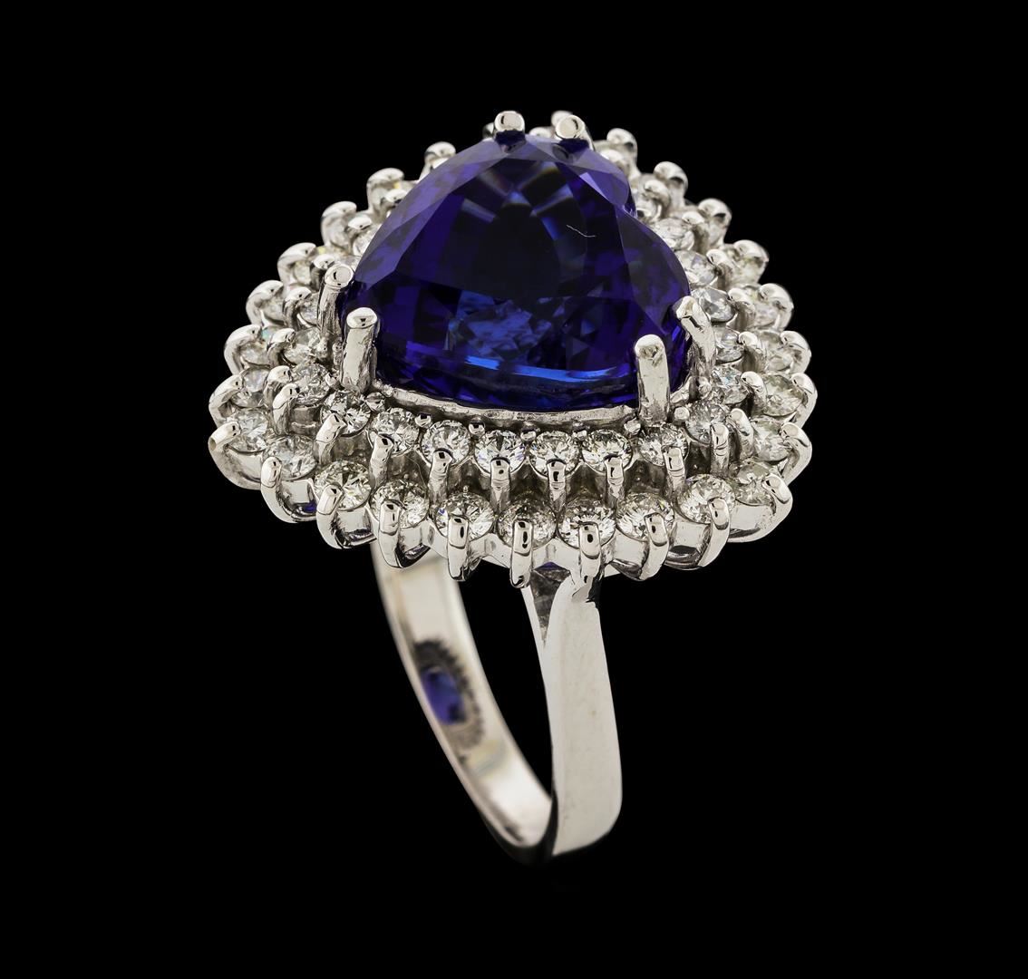 One electronically tested 14KT white gold lady's cast fashion ring with a double basket halo with a bright polish finish. The featured lady's ring has a shank measuring 2.64 millimeters wide. Identified with markings of 'K14'. Condition is new, good workmanship. Containing: One prong set heart modified brilliant cut natural tanzanite, measuring 12.75 x 12.83 x 9.18mm, (depth est.) 9%. bulge factor, approximate weight of 10.67ct., clarity is eye clean, dark, strong, violetish blue color, (GIA vB 7/5), cut is excellent. Transmitting light with no distortion, transparent. Colored gemstones are presumed to have been subjected to commonly used enhancement processes. Graded in the setting. Twenty-Seven prong set round brilliant cut diamonds, measuring 2.20 - 2.10 x 1.31mm (depth est.) approximate total weight of 27 Stones = 1.00ct. Graded in the setting. Clarity SI-1 to SI-2. Color: G - H Cut Good Twenty-Four prong set round brilliant cut diamonds, measuring 1.90 - 1.85 x 1.17mm (depth est.) approximate total weight of 24 Stones = 0.60ct. Graded in the setting. Clarity SI-1 to SI-2. Color: G - H Cut Good. Total Weight of Colored Stones 10.67ct.. Total Weight of Diamonds 1.60ct.. Total Weight of Ring 11.50gm. GAS Appraised at $23,330.00.