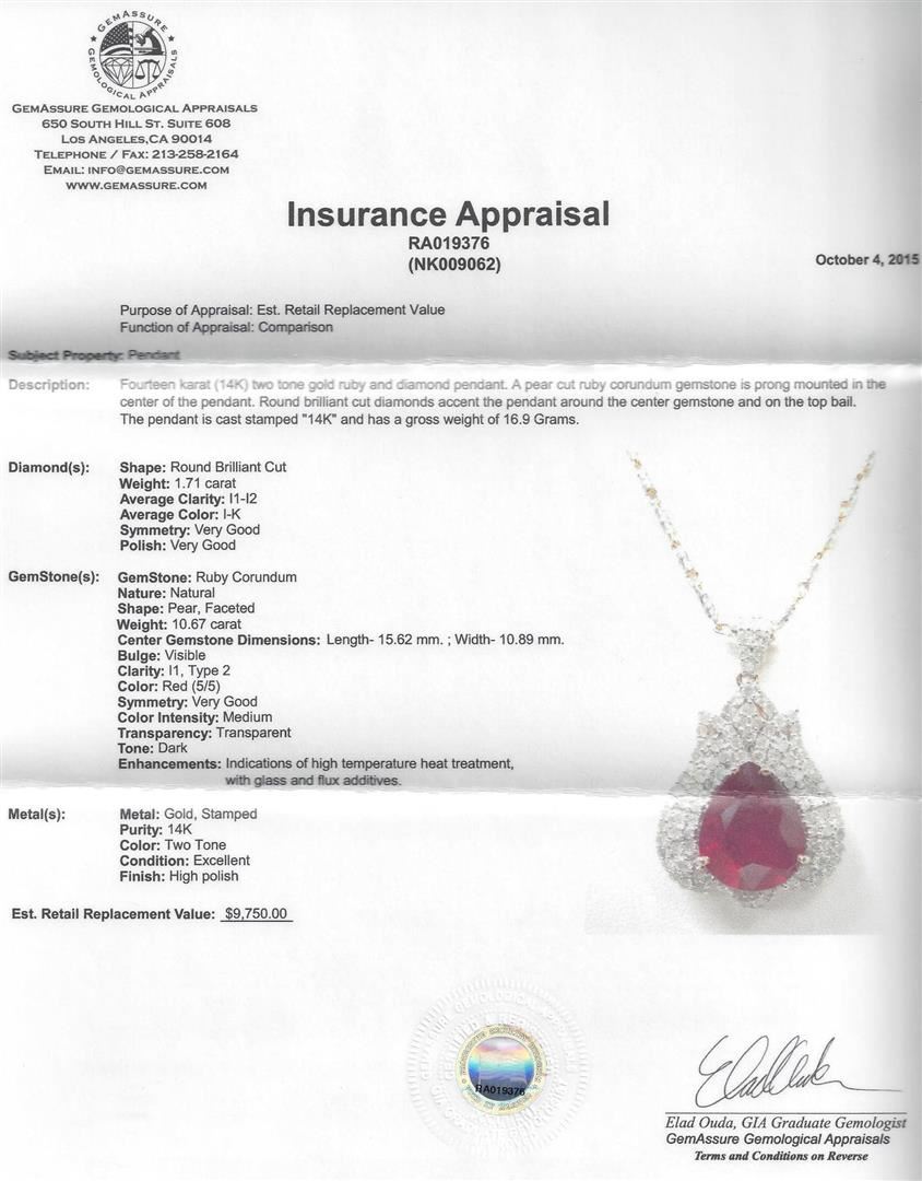 Fourteen karat (14K) two tone gold ruby and diamond pendant. A pear cut ruby corundum gemstone is prong mounted in the center of the pendant. Round brilliant cut diamonds accent the pendant around the center gemstone and on the top bail. The pendant is ca GGA Appraised.