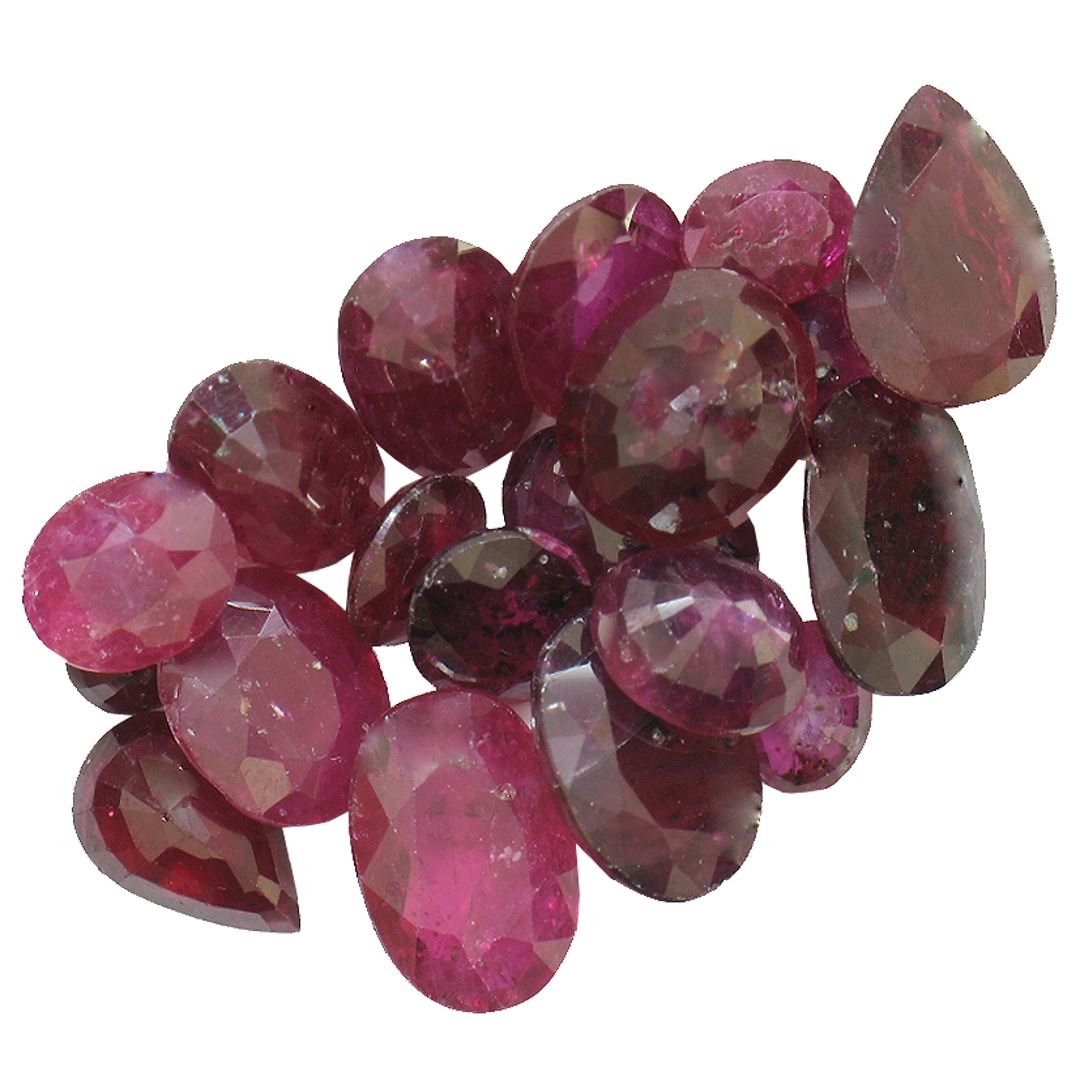 Nineteen various shapes & sizes cut natural rubies, measuring 13.50 x 10.00 x 6.00mm, exact total weight 10.67ct., clarity is heavily included, type II, dark, very slightly brownish, slightly purplish red color, (GIA slpR 7/3), cut is good. Transmitting light somewhat diffusely, transparent to translucent. Naturally occurring internal & external characteristics are present. Indications of laboratory high temperature heat treatment, with glass & flux additives. Ruby has a low tolerance to rhodium plating, repolishing the surface, & ultrasonic cleaning. Westfield Appraised at $1,065.00.