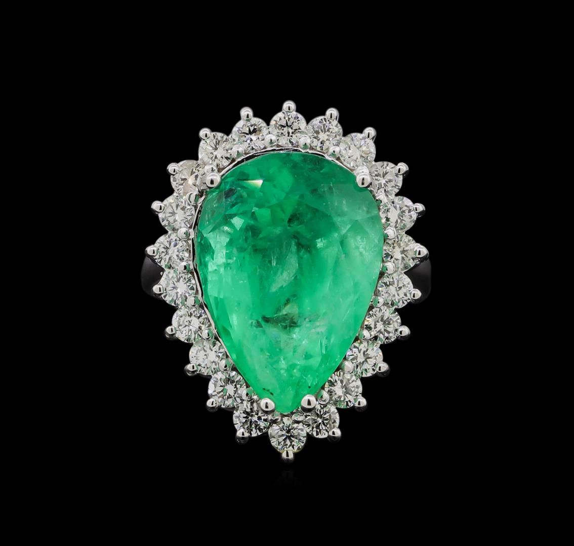 One electronically tested 14KT white gold lady's cast fashion ring with a basket halo with a bright polish finish. The featured lady's ring has a shank measuring 3.03 millimeters in width. Identified with markings of 'K14'. Condition is new, good workmanship. Containing: One prong set pear modified brilliant cut natural emerald, measuring 17.17 x 12.16 x 9.50mm, (depth est.) approximate weight of 10.69ct., clarity is moderately included, medium, moderately strong, green color, (GIA G 5/4), cut is good. Transmitting light somewhat diffusely, transparent to translucent. Indications of oil residue. Naturally occurring internal & external characteristics are present. Colored gemstones are presumed to have been subjected to commonly used enhancement processes. Graded in the setting. Twenty-Two prong set round brilliant cut diamonds, measuring 2.50 - 2.40 x 1.52mm (depth est.) approximate total weight of 22 Stones = 1.25ct. Graded in the setting. Clarity SI-1 to I-1. Color: H - I Cut Good. Total Weight of Colored Stones 10.69ct.. Total Weight of Diamonds 1.25ct.. Total Weight of Ring 9.60gm. GAS Appraised at $22,895.00.