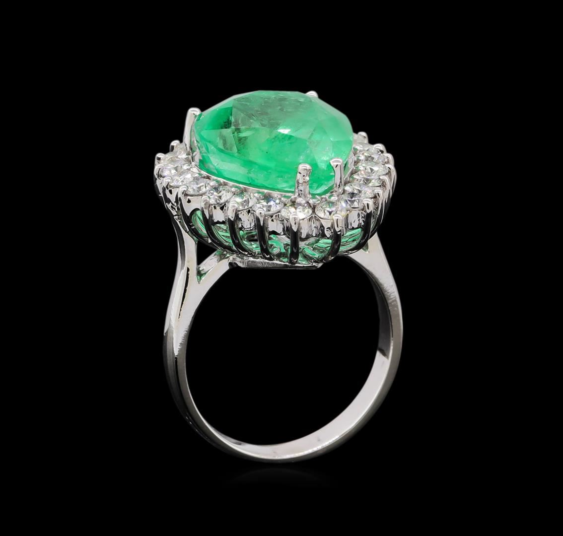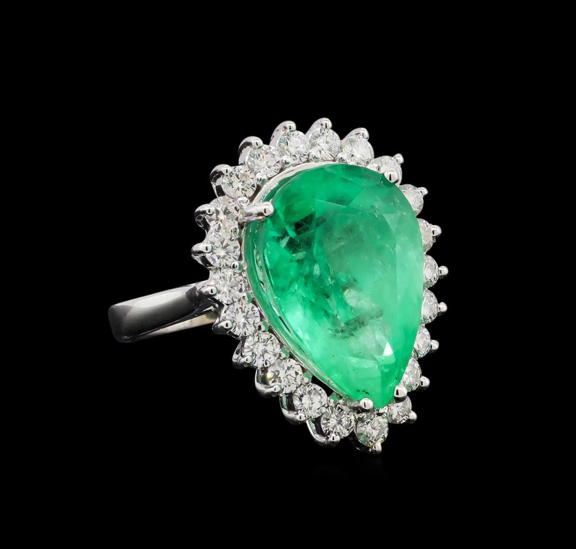 One electronically tested 14KT white gold lady's cast fashion ring with a basket halo with a bright polish finish. The featured lady's ring has a shank measuring 3.03 millimeters in width. Identified with markings of 'K14'. Condition is new, good workmanship. Containing: One prong set pear modified brilliant cut natural emerald, measuring 17.17 x 12.16 x 9.50mm, (depth est.) approximate weight of 10.69ct., clarity is moderately included, medium, moderately strong, green color, (GIA G 5/4), cut is good. Transmitting light somewhat diffusely, transparent to translucent. Indications of oil residue. Naturally occurring internal & external characteristics are present. Colored gemstones are presumed to have been subjected to commonly used enhancement processes. Graded in the setting. Twenty-Two prong set round brilliant cut diamonds, measuring 2.50 - 2.40 x 1.52mm (depth est.) approximate total weight of 22 Stones = 1.25ct. Graded in the setting. Clarity SI-1 to I-1. Color: H - I Cut Good. Total Weight of Colored Stones 10.69ct.. Total Weight of Diamonds 1.25ct.. Total Weight of Ring 9.60gm. GAS Appraised at $22,895.00.