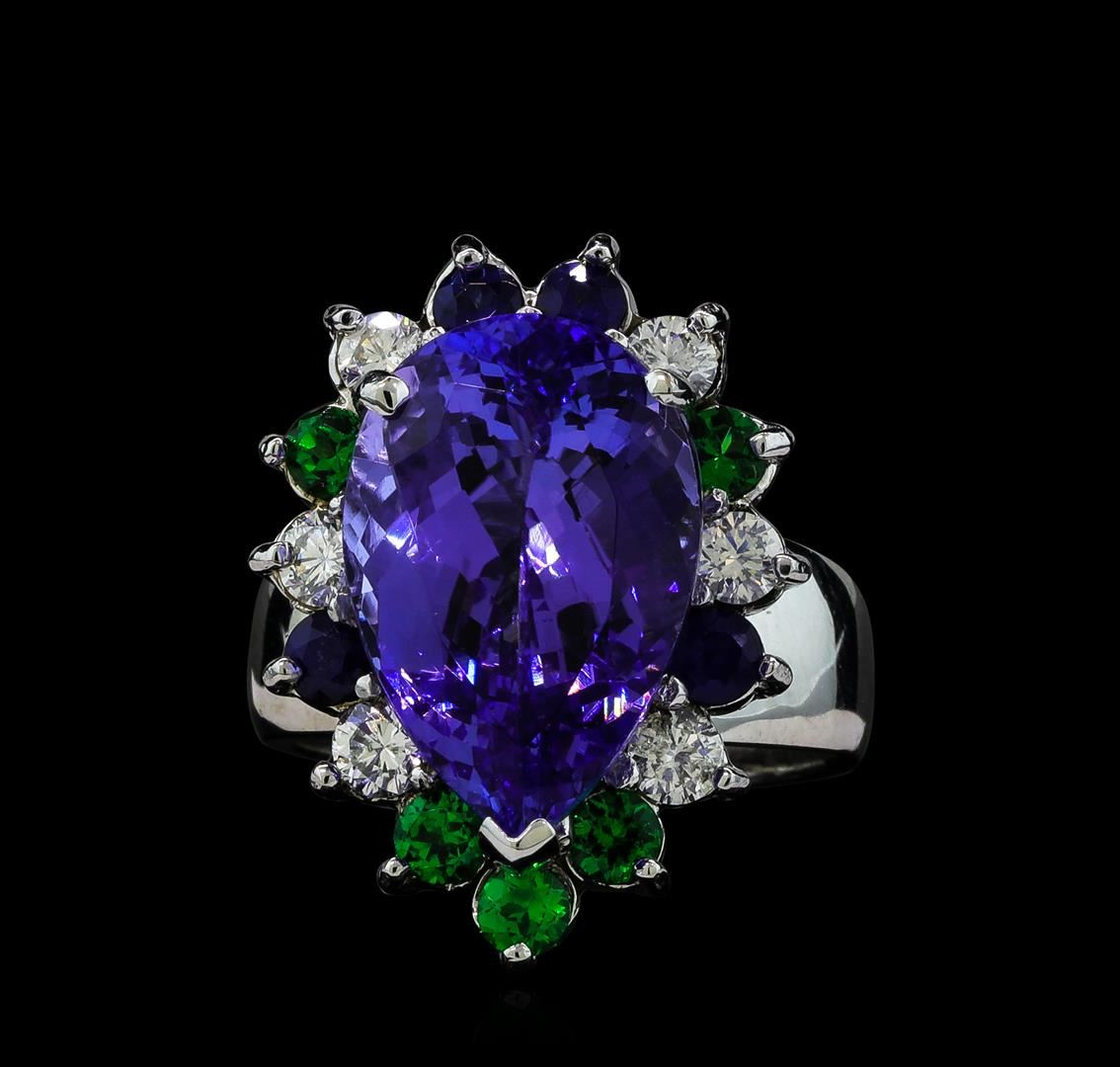 One prong set pear mixed cut natural tanzanite, measuring 16.50 x 11.10 x 8.30mm, 5%. bulge factor, approximate weight of 10.69ct., clarity is eye clean, type I, medium, very slightly grayish, bluish violet color, (GIA bV 5/3), cut is good. Transmitting light with no distortion, transparent. Graded in the setting. Tanzanite is a very rare gemstone that is only found in the country of Tanzania. Originally discovered in 1967. Tiffany & Company, named the stone Tanzanite. It is found in the Usumburu Mountains that border the Umba Valley of northern Tanzania. Tanzanite occurs in gray, brown, violet, blue, reddish-purple, & green. The gem is interesting because of its exceptional pleochroism. Rotated in different directions a tanzanite will exhibit multiple changes of color. Tanzanite has a low tolerance to ultrasonic cleaning, and should not be cleaned using this method. Five prong set round mixed cut natural tsavorite garnets, measuring 2.90 - 2.80 x 1.85 mm, approximate total weight of 0.55ct., clarity is eye clean, type II, medium, moderately strong, slightly yellowish green color, (GIA slyG 5/4), cut is good. Transmitting light with no distortion, transparent. Measurements & the color grade are an average for the group. Graded in the setting. Four prong set round mixed cut natural blue sapphires, measuring 3.00 - 2.80 x 1.89 mm, approximate total weight of 0.56ct., clarity is slightly included, type II, medium dark, moderately strong, blue color, (GIA B 6/4), cut is good. Transmitting light with a minimum of distortion, transparent. Naturally occurring internal & external characteristics are present. Indications of laboratory high temperature diffusion treatment. Measurements & the color grade are an average for the group. Graded in the setting. Six prong set round brilliant cut diamonds, measuring 3.00 - 3.00 x 1.80mm (depth est.) approximate total weight of 6 Stones = 0.62ct. The color and clarity grades reflect the entire ranges of color and clarity for this group. Graded in the setting. Clarity SI-2 to I-2. Color: F - I. Total Weight of Colored Stones 11.80ct.. Total Weight of Diamonds 0.62ct.. Total Weight of Ring 13.67gm. AIG Appraised at $26,345.00.