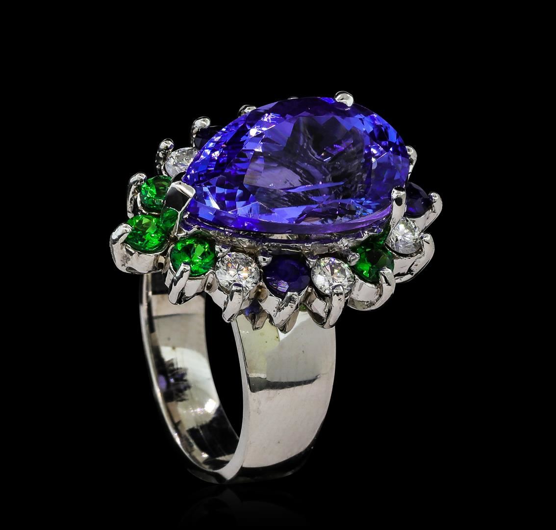 One prong set pear mixed cut natural tanzanite, measuring 16.50 x 11.10 x 8.30mm, 5%. bulge factor, approximate weight of 10.69ct., clarity is eye clean, type I, medium, very slightly grayish, bluish violet color, (GIA bV 5/3), cut is good. Transmitting light with no distortion, transparent. Graded in the setting. Tanzanite is a very rare gemstone that is only found in the country of Tanzania. Originally discovered in 1967. Tiffany & Company, named the stone Tanzanite. It is found in the Usumburu Mountains that border the Umba Valley of northern Tanzania. Tanzanite occurs in gray, brown, violet, blue, reddish-purple, & green. The gem is interesting because of its exceptional pleochroism. Rotated in different directions a tanzanite will exhibit multiple changes of color. Tanzanite has a low tolerance to ultrasonic cleaning, and should not be cleaned using this method. Five prong set round mixed cut natural tsavorite garnets, measuring 2.90 - 2.80 x 1.85 mm, approximate total weight of 0.55ct., clarity is eye clean, type II, medium, moderately strong, slightly yellowish green color, (GIA slyG 5/4), cut is good. Transmitting light with no distortion, transparent. Measurements & the color grade are an average for the group. Graded in the setting. Four prong set round mixed cut natural blue sapphires, measuring 3.00 - 2.80 x 1.89 mm, approximate total weight of 0.56ct., clarity is slightly included, type II, medium dark, moderately strong, blue color, (GIA B 6/4), cut is good. Transmitting light with a minimum of distortion, transparent. Naturally occurring internal & external characteristics are present. Indications of laboratory high temperature diffusion treatment. Measurements & the color grade are an average for the group. Graded in the setting. Six prong set round brilliant cut diamonds, measuring 3.00 - 3.00 x 1.80mm (depth est.) approximate total weight of 6 Stones = 0.62ct. The color and clarity grades reflect the entire ranges of color and clarity for this group. Graded in the setting. Clarity SI-2 to I-2. Color: F - I. Total Weight of Colored Stones 11.80ct.. Total Weight of Diamonds 0.62ct.. Total Weight of Ring 13.67gm. AIG Appraised at $26,345.00.