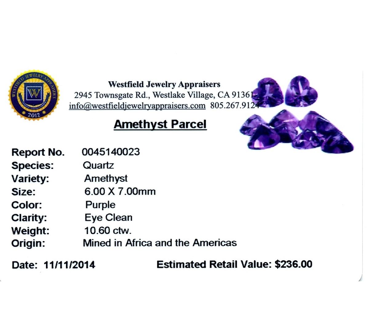 10.6ct Heart Cut Amethyst Parcel. Westfield Appraised at $236.00.