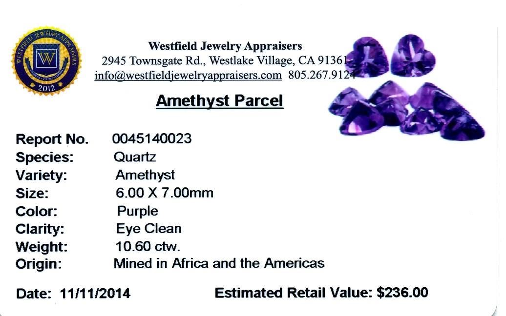 10.6ct Heart Cut Amethyst Parcel. Westfield Appraised at $236.00.