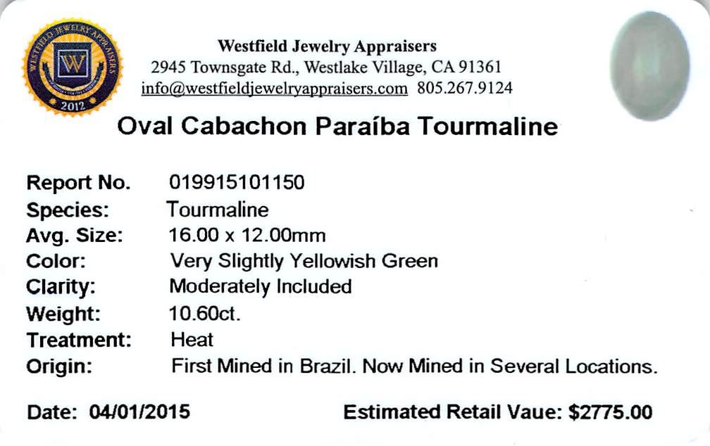 One oval cabochon cut natural Paraiba tourmaline exact weight 10.60ct., clarity is moderately included, cut is good. Westfield Appraised at $2,775.00.