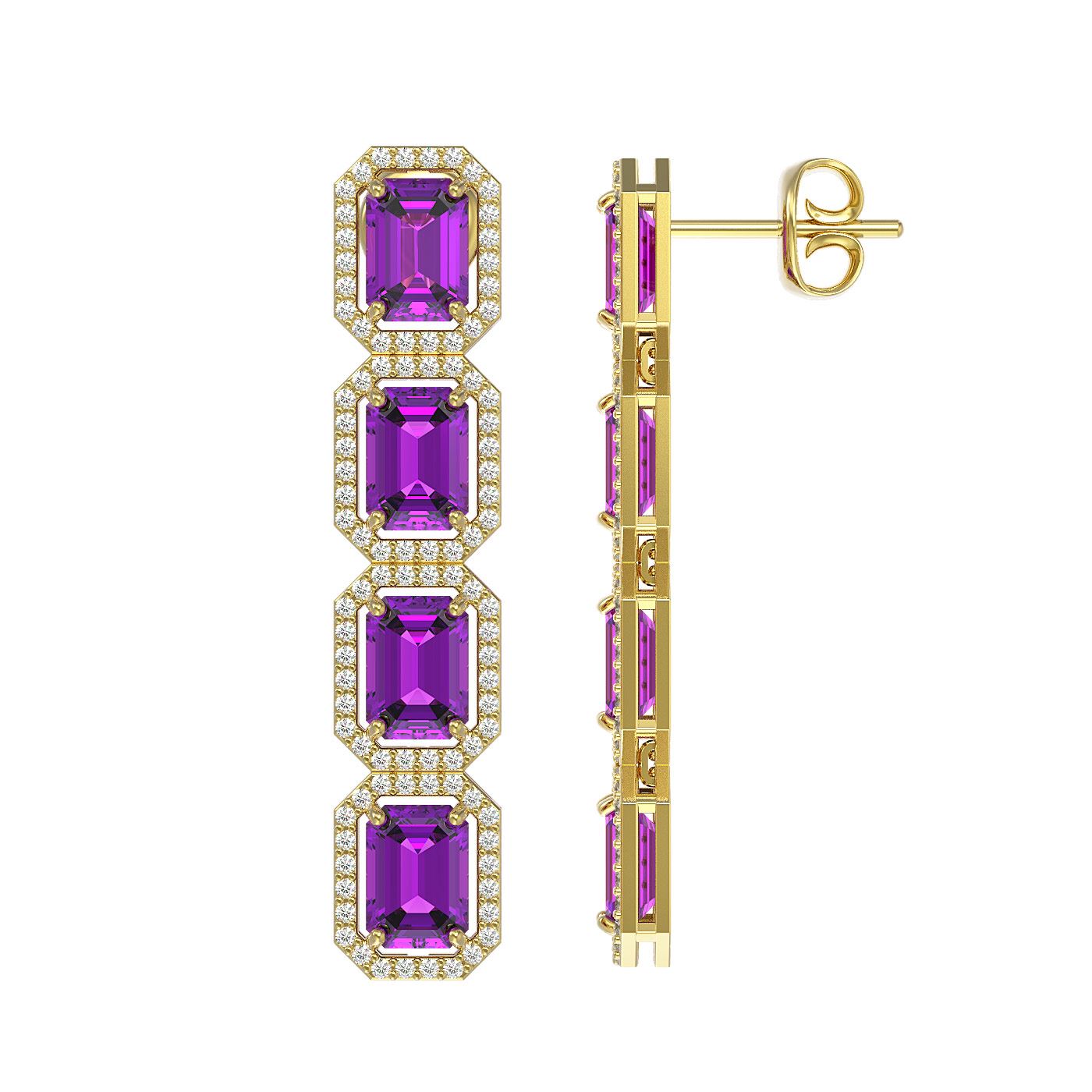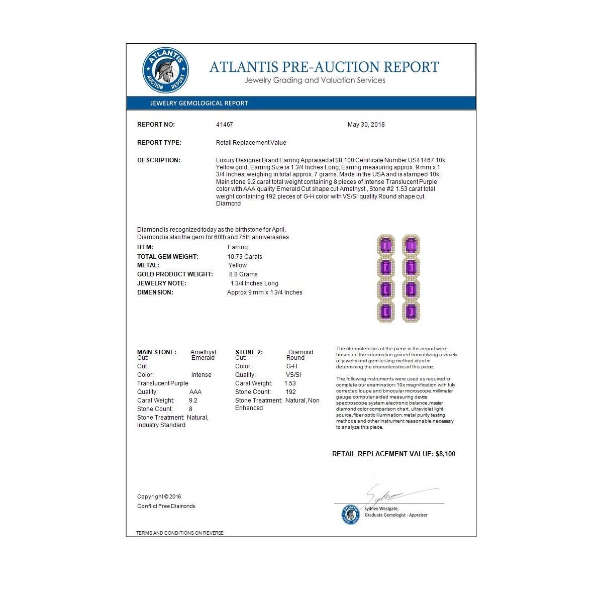 REF-147H3A -41467 ---- 10.73 CTW Amethyst & Diamond Halo Earrings 10K Yellow Gold ---- Luxury Designer Brand Earring Appraised at $8,100 Certificate Number US41467 10k Yellow gold, Earring Size is 1 3/4 Inches Long, Earring measuring approx. 9 mm x 1 3/4 Inches, weighing in total approx. 7 grams. Made in the USA and is stamped 10k, Main stone 9.2 carat total weight containing 8 pieces of Intense Translucent Purple color with AAA quality Emerald Cut shape cut Amethyst , Stone #2 1.53 carat total weight containing 192 pieces of G-H color with VS/SI quality Round shape cut Diamond