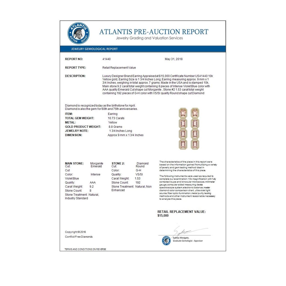 REF-272X5T -41440 ---- 10.73 CTW Morganite & Diamond Halo Earrings 10K Yellow Gold ---- Luxury Designer Brand Earring Appraised at $15,000 Certificate Number US41440 10k Yellow gold, Earring Size is 1 3/4 Inches Long, Earring measuring approx. 9 mm x 1 3/4 Inches, weighing in total approx. 7 grams. Made in the USA and is stamped 10k, Main stone 9.2 carat total weight containing 8 pieces of Intense Violet Blue color with AAA quality Emerald Cut shape cut Morganite , Stone #2 1.53 carat total weight containing 192 pieces of G-H color with VS/SI quality Round shape cut Diamond