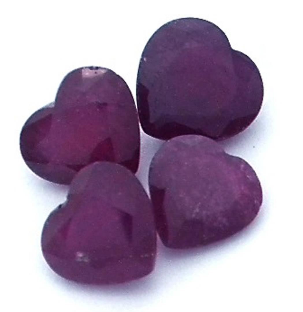 Four heart mixed cut natural rubies, measuring 8.30 x 8.80 x 5.30mm, exact total weight 10.73ct., clarity is heavily included, type II, dark, very slightly brownish, red color, (GIA R 7/3), cut is good. Measurements are an average for the group. Transmitting light somewhat diffusely, transparent to translucent. Naturally occurring internal & external characteristics are present. Indications of laboratory high temperature heat treatment, with glass & flux additives. Ruby has a low tolerance to rhodium plating, repolishing the surface, & ultrasonic cleaning. Westfield Appraised at $1,360.00.