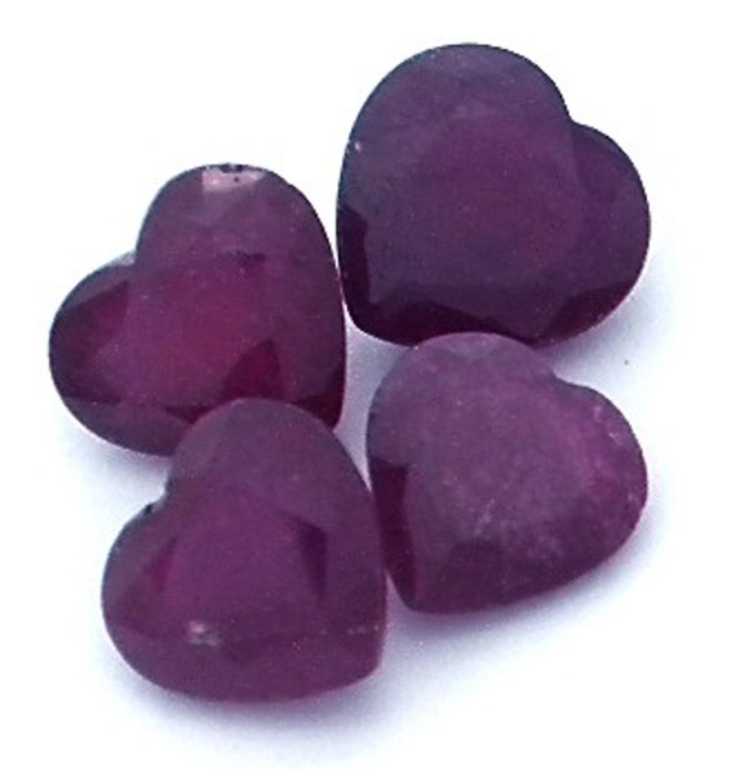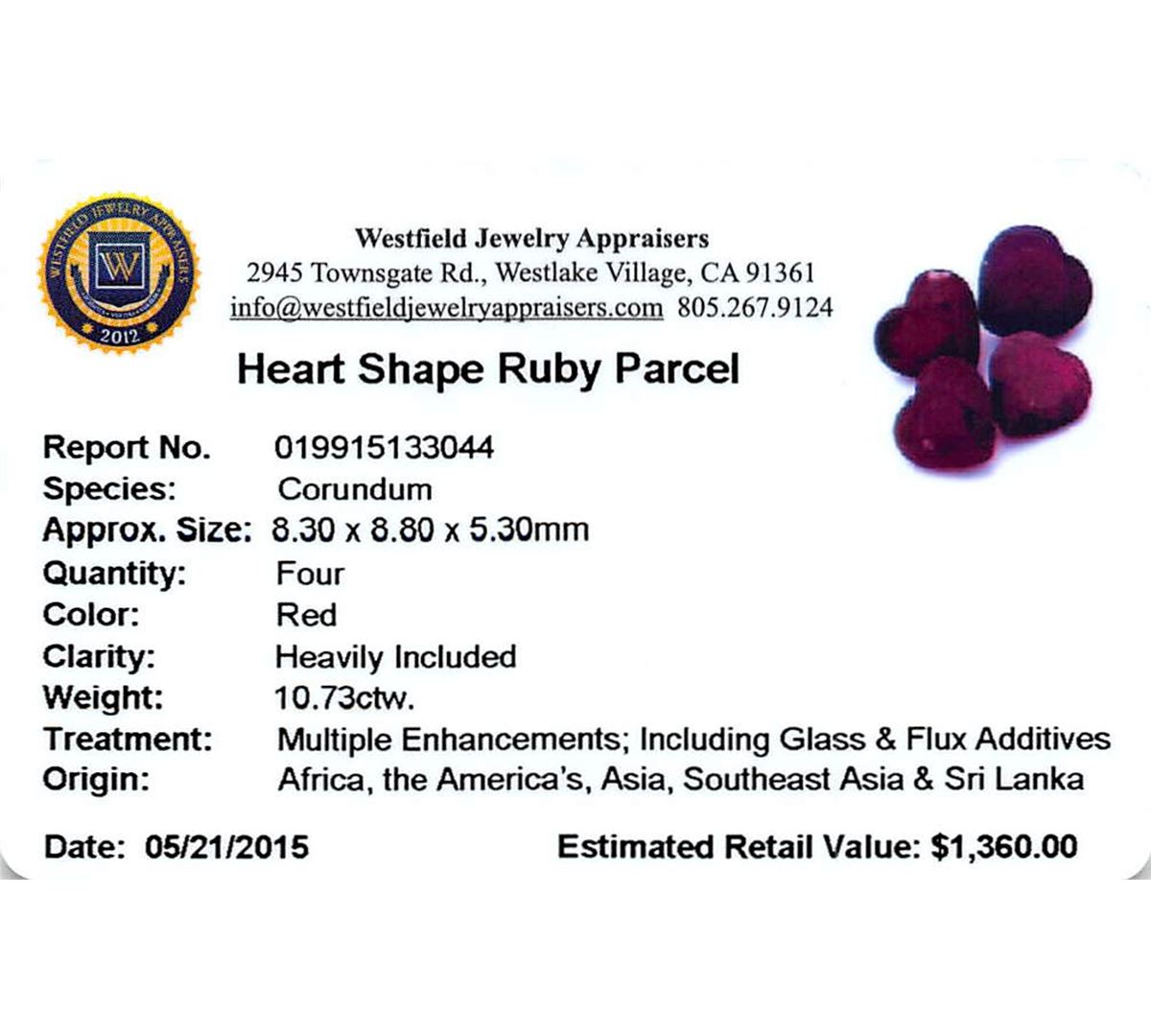 Four heart mixed cut natural rubies, measuring 8.30 x 8.80 x 5.30mm, exact total weight 10.73ct., clarity is heavily included, type II, dark, very slightly brownish, red color, (GIA R 7/3), cut is good. Measurements are an average for the group. Transmitting light somewhat diffusely, transparent to translucent. Naturally occurring internal & external characteristics are present. Indications of laboratory high temperature heat treatment, with glass & flux additives. Ruby has a low tolerance to rhodium plating, repolishing the surface, & ultrasonic cleaning. Westfield Appraised at $1,360.00.