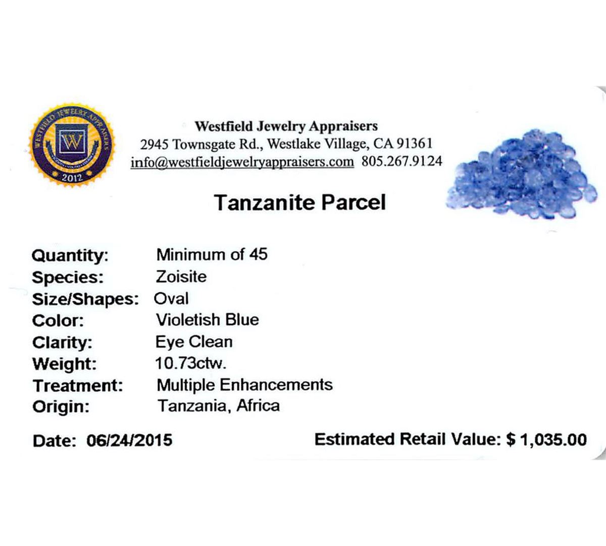 Forty-five oval mixed cut natural tanzanites, measuring 4.00 x 3.00 x 2.50mm, exact total weight 10.73ct., clarity is slightly included, type I, medium dark, very slightly grayish, violetish blue color, (GIA vB 6/3), cut is good. Measurements & the color grade are an average for the group, Color grade is an average for the group, Transmitting light with no distortion, transparent, Naturally occurring internal & external characteristics are present, Indications of multiple laboratory enhancements, including high temperature heat treatment. Westfield Appraised at $1,035.00.
