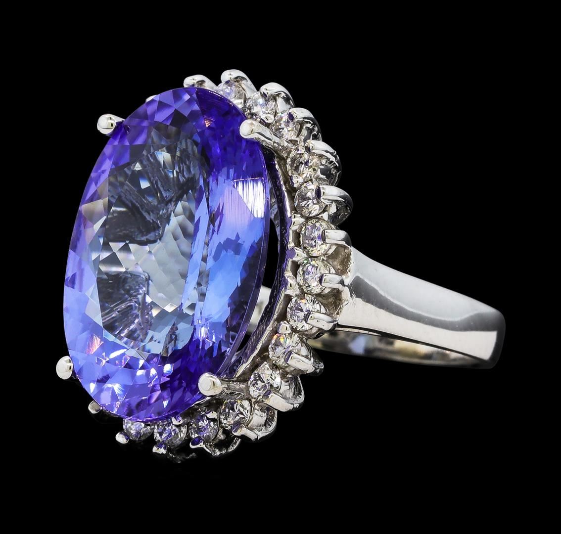 One electronically tested 14KT white gold lady's cast fashion ring with a basket halo with a bright polish finish. The featured lady's ring has a shank measuring 2.51 millimeters wide. Identified with markings of '14K'. Condition is new, good workmanship. Containing: One prong set oval modified brilliant cut natural tanzanite, measuring 17.86 x 12.49 x 6.97mm, (depth est.) approximate weight of 10.74ct., clarity is eye clean, medium, very slightly grayish, violetish blue color, (GIA vB 5/3), cut is very good. Transmitting light with no distortion, transparent. Colored gemstones are presumed to have been subjected to commonly used enhancement processes. Graded in the setting. Twenty-Four prong set round brilliant cut diamonds, measuring 1.90 - 1.85 x 1.17mm (depth est.) approximate total weight of 24 Stones = 0.60ct. Graded in the setting. Clarity VS-2 to SI-2. Color: H - I Cut Good. Total Weight of Colored Stones 10.74ct.. Total Weight of Diamonds 0.60ct.. Total Weight of Ring 8.70gm. GAS Appraised at $17,405.00.