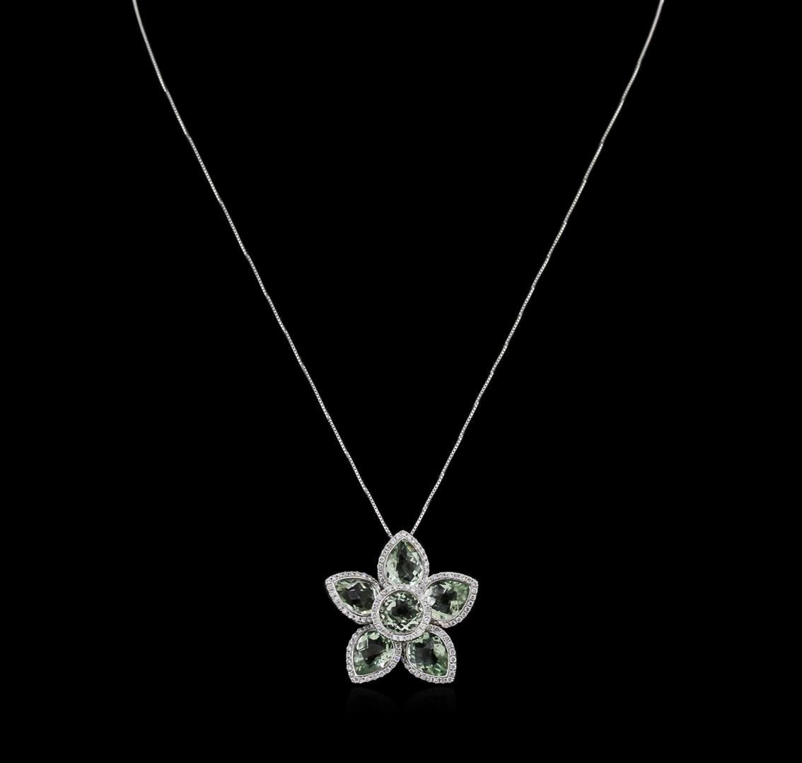 One pendant with chain featuring: 14KT white gold weighing 6.60 grams containing multiple green amethyst with a total weight of 10.75ct and diamonds with a total weight of 0.72ct.