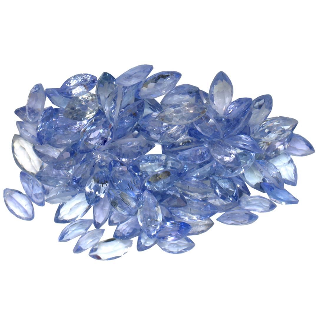 Seventy marquise mixed cut natural tanzanites, measuring 4.00 x 3.00 x 2.00mm, exact total weight 10.75ct., clarity is slightly included, type I, medium dark, very slightly grayish, violetish blue color, (GIA vB 6/3), cut is good. Measurements & the color grade are an average for the group, Color grade is an average for the group, Transmitting light with no distortion, transparent, Naturally occurring internal & external characteristics are present, Indications of multiple laboratory enhancements, including high temperature heat treatment. Westfield Appraised at $1,035.00.